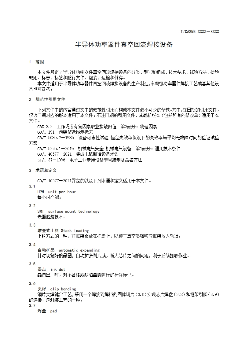 半导体功率器件真空回流焊接设备Vacuumreflowsolderingequipmentforsemiconductorpowerdevices348072@abc13小时前发布关注私信0.50MB17页021半导体功率器件真空回流焊接设备Vacuumreflowsolderingequipmentforsemiconductorpowerdevices此内容为付费资源,请付费后查看¥19¥23黄金会员免费钻石会员免费立即购买您当前未登录!建议登陆后购买,可保存购买订单付费资源 第1页 / 共17页 第2页 / 共17页 第3页 / 共17页 第4页 / 共17页 第5页 / 共17页 试读已结束,还剩12页,您可下载完整版后进行离线阅读 THE END标准规范 文本预览 ICS点击此处添加1Cs号CCS点击此处添加cCS号T/CASME团体标准T/CASME XXXX-XXXX半导体功率器件真空回流焊接设备Vacuum reflow soldering equipment for semiconductor power devices(征求意见稿)在提交反馈意见时,请将您知道的相联专连同肢持性文件一并附上。2025-XX-XX发布2025-XX-XX实施中国中小商业企业协会发布工 查看更多 收起部分 喜欢就支持一下吧收藏