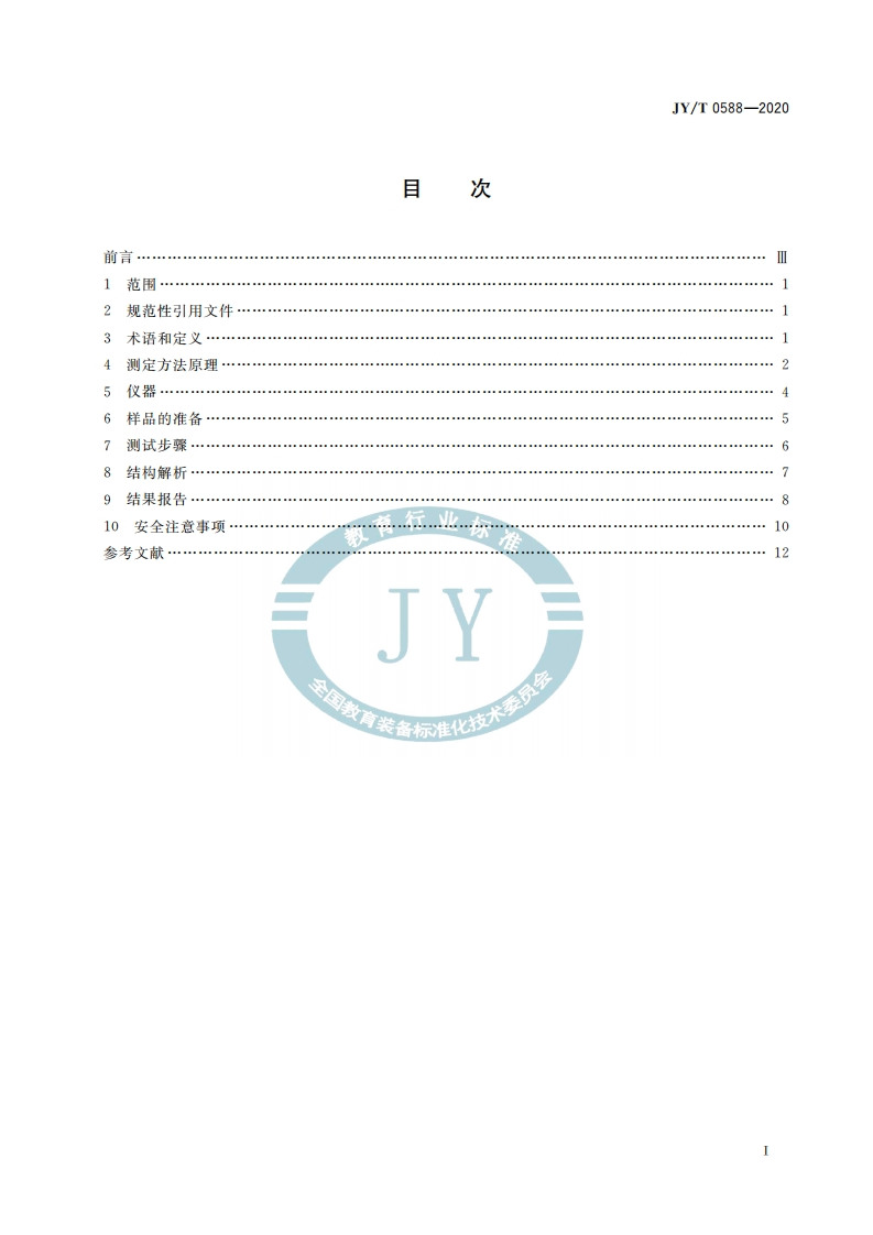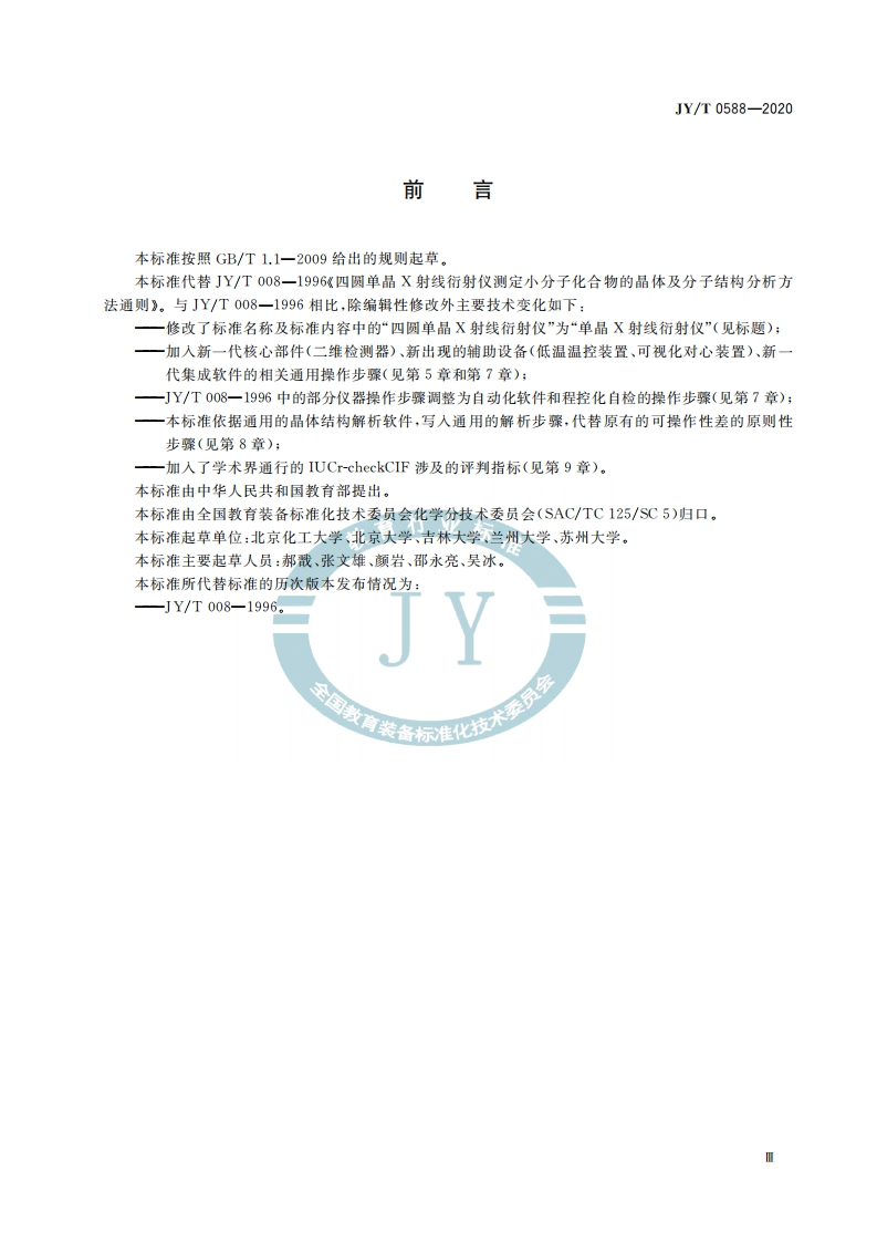 ICS03.180Y51JY中华人民共和国教育行业标准JY/T0588-2020代替JY/T008-1996单晶X射线衍射仪测定小分子化合物的晶体及分子结构分析方法通则T YTGeneral rules for crystal and molecular structure determinationof small molecules by single crystal X-ray diffractometer【全国教育装备标准化技术委员么人2020-09-29发布2020-12-01实施中华人民共和国教育部发布
