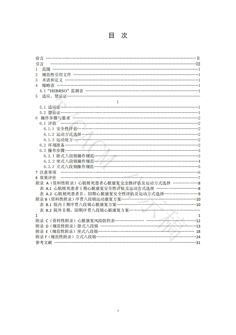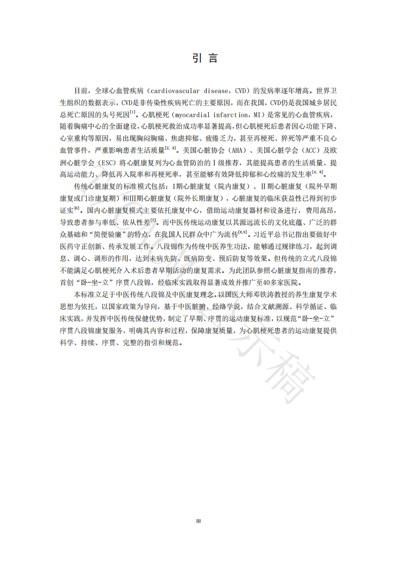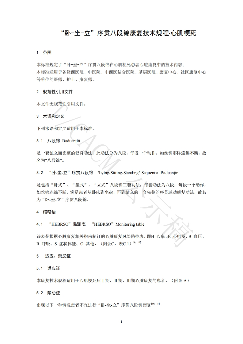 卧-坐-立序贯八段锦康复技术规程·心肌梗死-送审稿348072@abc23小时前发布关注私信2.38MB35页023卧-坐-立序贯八段锦康复技术规程·心肌梗死-送审稿此内容为付费资源,请付费后查看¥19¥23黄金会员免费钻石会员免费立即购买您当前未登录!建议登陆后购买,可保存购买订单付费资源 第1页 / 共35页 第2页 / 共35页 第3页 / 共35页 第4页 / 共35页 第5页 / 共35页 试读已结束,还剩30页,您可下载完整版后进行离线阅读 THE END标准规范 文本预览 ICS米*米**米*C*米老on of Chin团体标准T/CACM****一20**“卧-坐-立”序贯八段锦康复技术规程·心肌梗死"Lying-Sitting-Standing"Sequential Baduanjin Rehabilitation TechnicalRegulation.Myocardial Infarction(文件类型:公示稿)20**-*-**发布20*米-*-*实施中华中医药学会发布 查看更多 收起部分 喜欢就支持一下吧收藏