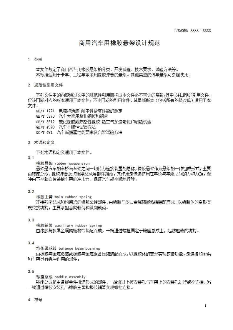 ICS点击此处添加1Cs号CCS点击此处添加cCS号TCASME团体标准T/CASME XXXX-XXXX商用汽车用橡胶悬架设计规范Specification for Design specification ofrubber suspension for commercial vehicles(征求意见稿)在提交反馈意见时,请将您知道的相联专连同肢持性文件一并附上。XXXX-XX-XX发布XXXX-XX-XX实施中国中小商业企业协会发布