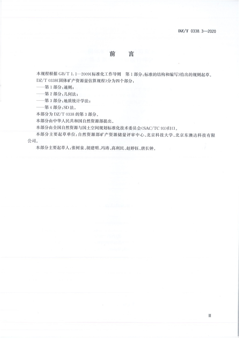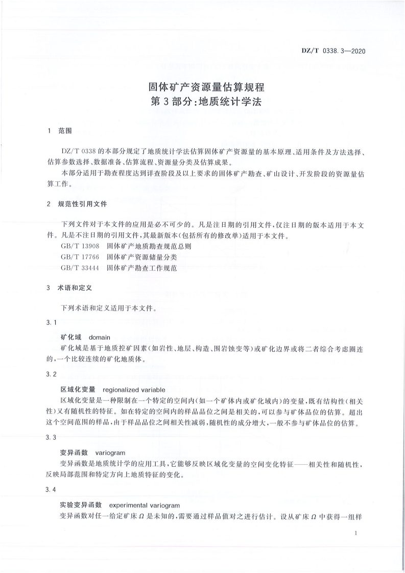 固体矿产资源量估算规程第3部分_地质统计学法RegulationsofmineralresourcesestimationPart3_Thegeostatisticalmethods348072@abc前天发布关注私信8.80MB25页038固体矿产资源量估算规程第3部分_地质统计学法RegulationsofmineralresourcesestimationPart3_Thegeostatisticalmethods此内容为付费资源,请付费后查看¥19¥23黄金会员免费钻石会员免费立即购买您当前未登录!建议登陆后购买,可保存购买订单付费资源 第1页 / 共25页 第2页 / 共25页 第3页 / 共25页 第4页 / 共25页 第5页 / 共25页 试读已结束,还剩20页,您可下载完整版后进行离线阅读 THE END标准规范 文本预览 1CS73.020D10/190z中华人民共和国地质矿产行业标准DZ/T0338.3—2020固体矿产资源量估算规程第3部分:地质统计学法Regulations of mineral resources estimation-Part 3:The geostatistical methods2020-04-30发布2020-04-30实施中华人民共和国自然资源部发布 查看更多 收起部分 喜欢就支持一下吧收藏