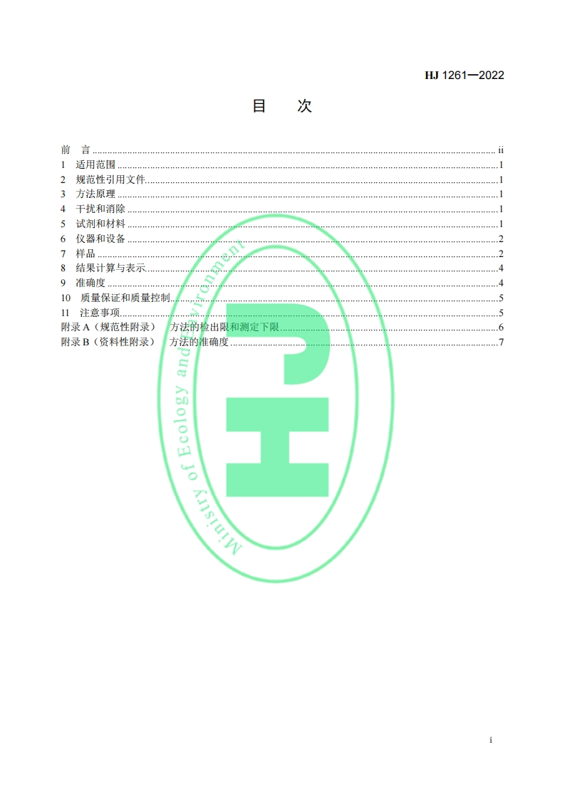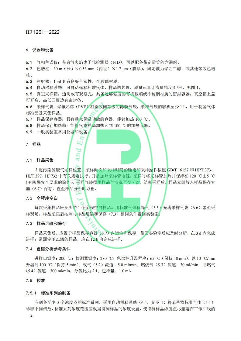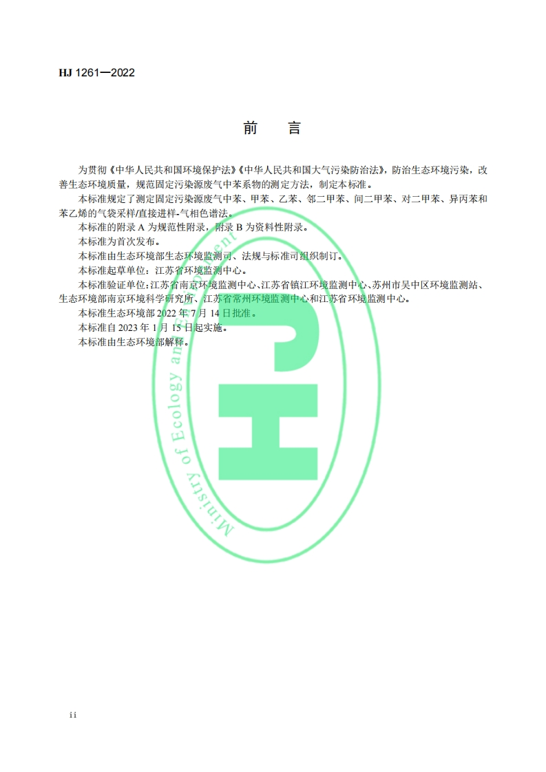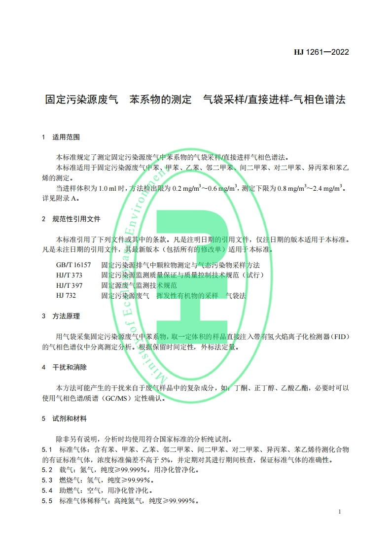 HJ中华人民共和国国家生态环境标准HJ1261-2022onment固定污染源废气苯系物的测定气袋采样直接进样气相色谱法Stationary source emission-Determination of benzene and its analogies-Bags sampling/Direct injection-gas chromatography本电子版为正式标准文本,由生态环境部环境标准研究所审校排版。Ansiuw2022-07-14发布2023-01-15实施生态环境邵发布