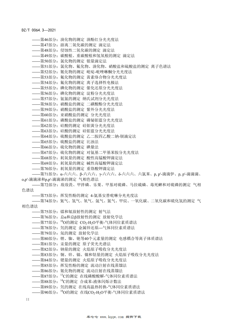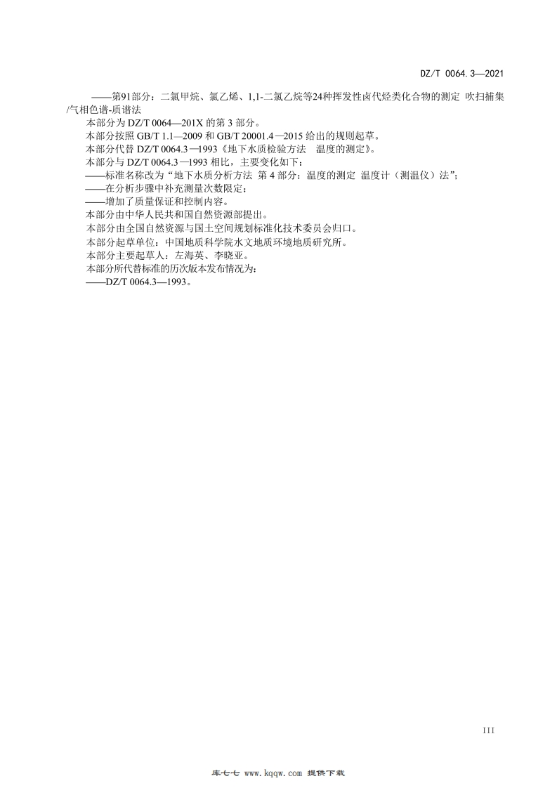 ICS73.080D59DZ中华人民共和国地质矿产行业标准DZ/T0064.3-2021代替DZ/T0064.3-1993地下水质分析方法第3部分:温度的测定温度计(测温仪)法Methods for analysis of groundwater quality-Part3:Determination of temperatureThermometer(thermometer)method2021-02-22发布2021-07-01实施中华人民共和国自然资源部发布