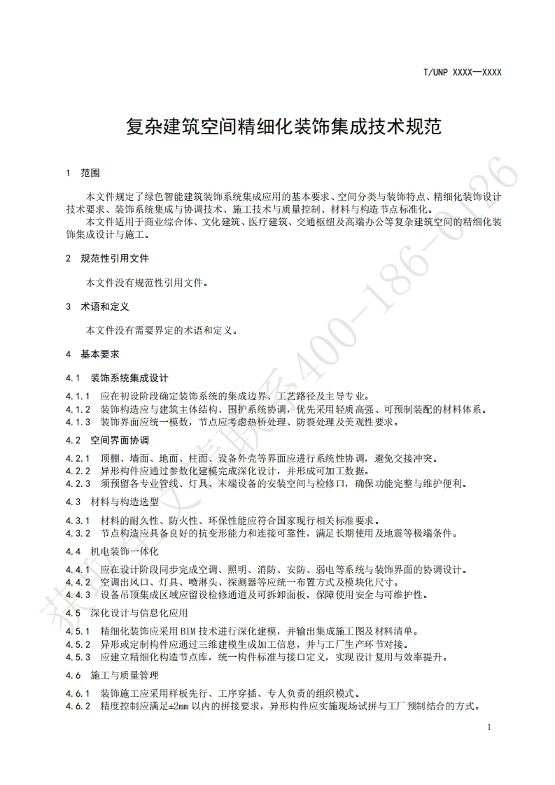 复杂建筑空间精细化装饰集成技术规范Specificationforrefineddecorationintegrationtechnologyincomplexarchitecturaspaces348072@abc前天发布关注私信0.19MB4页042复杂建筑空间精细化装饰集成技术规范Specificationforrefineddecorationintegrationtechnologyincomplexarchitecturaspaces此内容为付费资源,请付费后查看¥19¥23黄金会员免费钻石会员免费立即购买您当前未登录!建议登陆后购买,可保存购买订单付费资源 第1页 / 共4页 第2页 / 共4页 第3页 / 共4页 第4页 / 共4页 已完成全部阅读,共4页 THE END标准规范 文本预览 ICS91.080.10UNSPSC 72.15.36CCSP32UNP团体标准T/UNP XXXX-XXXX复杂建筑空间精细化装饰集成技术规范Specification for refined decoration integration technology in complex architecturalspaces文请联在提交反债意见时,请将您知道的相关专利连同支持性文件一并附上。获取XXXx-x-XX发布XXXX-x-XX实施中国联合国采购促进会发布 查看更多 收起部分 喜欢就支持一下吧收藏