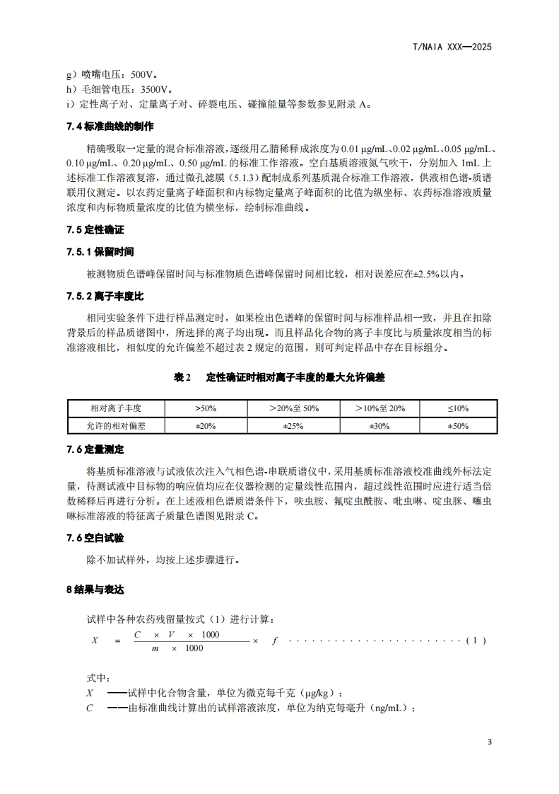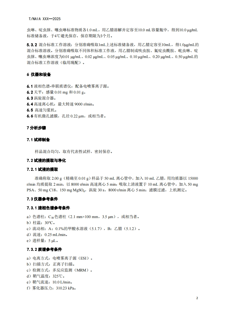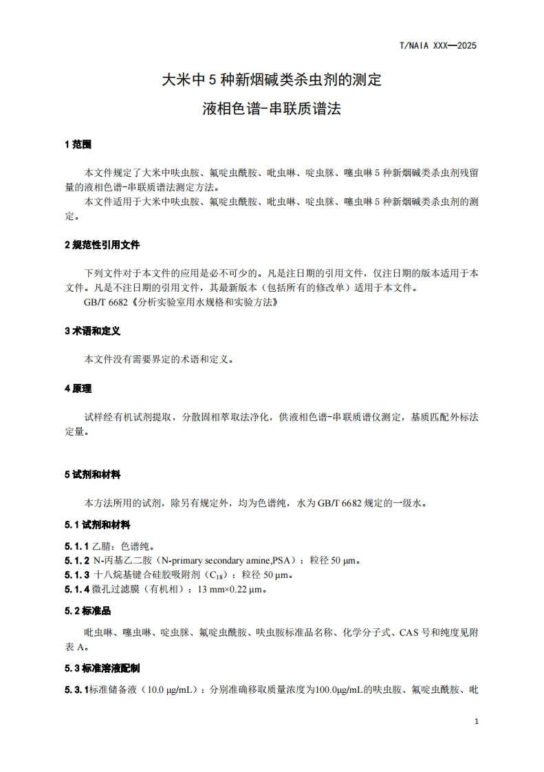 大米中5种新烟碱类杀虫剂的测定液相色谱-串联质谱法DeterminationofFiveNeonicotinoidinsecticidesinRicebyHPLC-MS_MS348072@abc前天发布关注私信1.14MB10页048大米中5种新烟碱类杀虫剂的测定液相色谱-串联质谱法DeterminationofFiveNeonicotinoidinsecticidesinRicebyHPLC-MS_MS此内容为付费资源,请付费后查看¥19¥23黄金会员免费钻石会员免费立即购买您当前未登录!建议登陆后购买,可保存购买订单付费资源 第1页 / 共10页 第2页 / 共10页 第3页 / 共10页 第4页 / 共10页 第5页 / 共10页 试读已结束,还剩5页,您可下载完整版后进行离线阅读 THE END标准规范 文本预览 ICS67.050B20团体标准T/NAIA XXX-2025大米中5种新烟碱类杀虫剂的测定液相色谱-串联质谱法Determination of Five Neonicotinoid Insecticides in Rice byHPLC-MS/MS2025-XX-XX发布2025-XX-XX实施宁夏化学分析测试协会发布 查看更多 收起部分 喜欢就支持一下吧收藏
