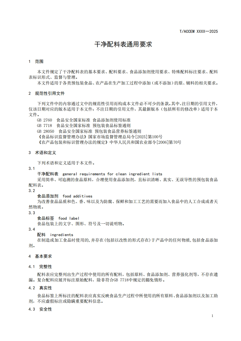 干净配料表通用要求Generalrequirementsforcleaningredientlists348072@abc前天发布关注私信0.23MB6页021干净配料表通用要求Generalrequirementsforcleaningredientlists此内容为付费资源,请付费后查看¥19¥23黄金会员免费钻石会员免费立即购买您当前未登录!建议登陆后购买,可保存购买订单付费资源 第1页 / 共6页 第2页 / 共6页 第3页 / 共6页 第4页 / 共6页 第5页 / 共6页 试读已结束,还剩1页,您可下载完整版后进行离线阅读 THE END标准规范 文本预览 ICSccsT/ACCEM团体标准T/ACCEM XXXX-2025干净配料表通用要求General requirements for clean ingredient lists(征求意见稿)2025-Xx-XX发布2025-Xx-XX实施中国商业企业管理协会发布 查看更多 收起部分 喜欢就支持一下吧收藏