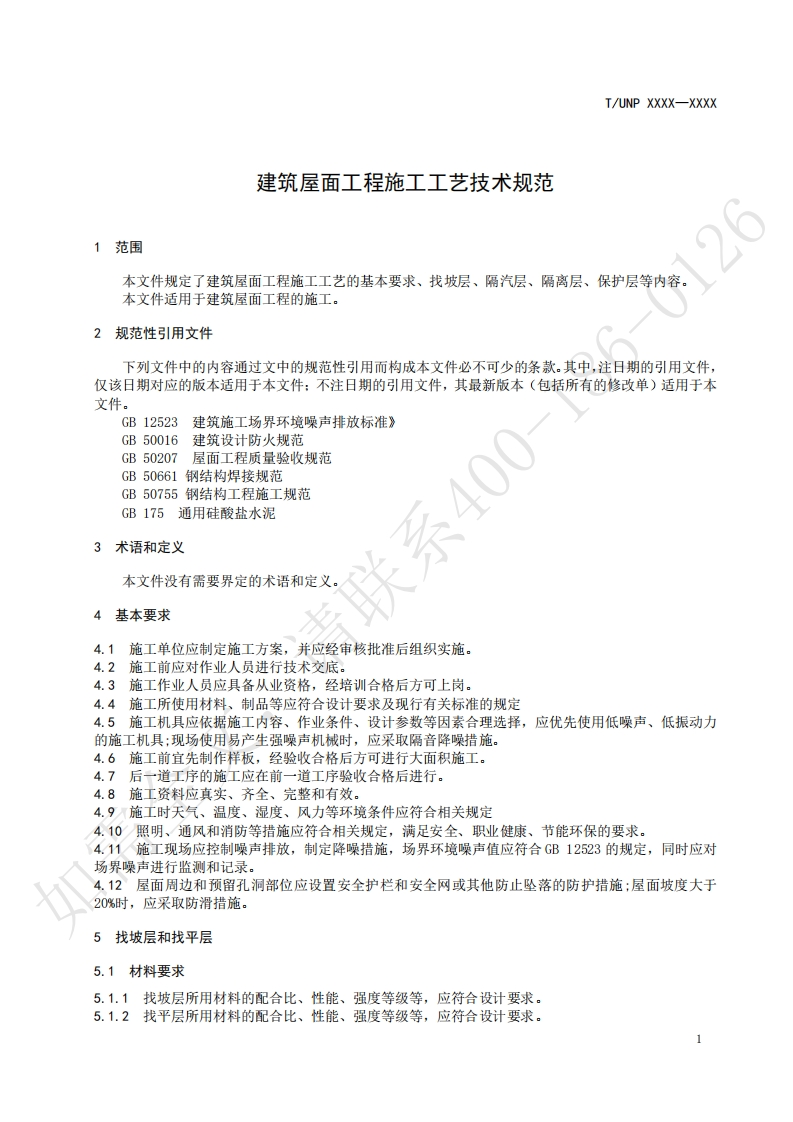 建筑屋面工程施工工艺技术规范Technicalspecificationforconstructionprocessofbuildingroofingworks请明348072@abc前天发布关注私信0.19MB5页047建筑屋面工程施工工艺技术规范Technicalspecificationforconstructionprocessofbuildingroofingworks请明此内容为付费资源,请付费后查看¥19¥23黄金会员免费钻石会员免费立即购买您当前未登录!建议登陆后购买,可保存购买订单付费资源 第1页 / 共5页 第2页 / 共5页 第3页 / 共5页 第4页 / 共5页 第5页 / 共5页 已完成全部阅读,共5页 THE END标准规范 文本预览 ICS91.060.20UNSPSC 81.10.15CCSP32UNP团体标准T/UNP XXXX-XXXX建筑屋面工程施工工艺技术规范Technical specification for construction process of building roofing works请在提交反债意见时,请将您知道的相关专利连同支持性文件一并附上。如需XXXX-Xx-XX发布XXXX-x-XX实施中国联合国采购促进会发布 查看更多 收起部分 喜欢就支持一下吧收藏