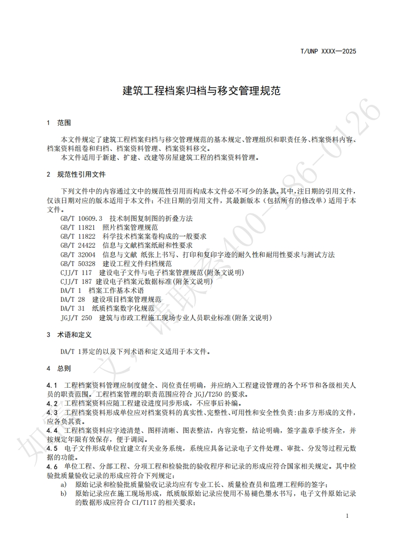 ICS01.140.20UNSPSC 93.14.20CCSA14UNP团体标准T/UNP XXXX-2025建筑工程档案归档与移交管理规范Code for archiving and transfer management of construction project files请在提交反债意见时,请将您知道的相关专利连同支持性文件一并附上。如需XXXX-Xx-XX发布XXXX-x-XX实施中国联合国采购促进会发布