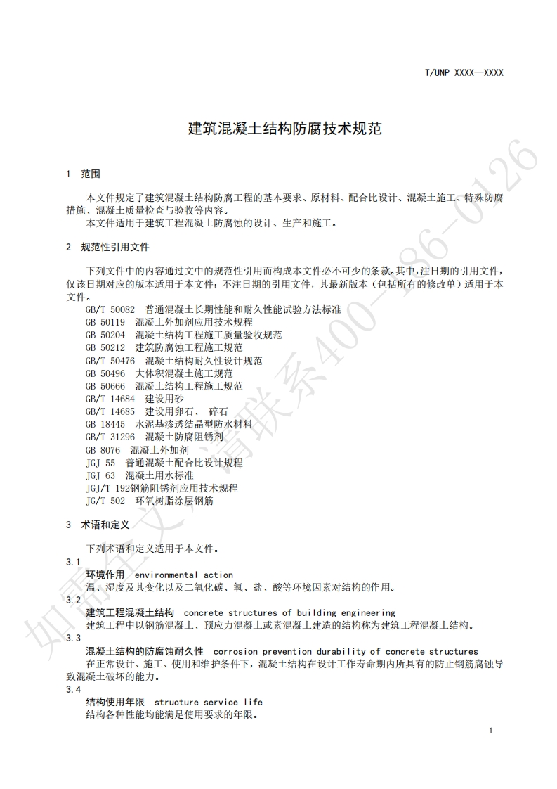 建筑混凝土结构防腐技术规范Technicalspecificationforanti-corrosionofbuildingconcretestructures请助(草案)(本草案完成时间_)348072@abc昨天发布关注私信0.19MB5页023建筑混凝土结构防腐技术规范Technicalspecificationforanti-corrosionofbuildingconcretestructures请助(草案)(本草案完成时间_)此内容为付费资源,请付费后查看¥19¥23黄金会员免费钻石会员免费立即购买您当前未登录!建议登陆后购买,可保存购买订单付费资源 第1页 / 共5页 第2页 / 共5页 第3页 / 共5页 第4页 / 共5页 第5页 / 共5页 已完成全部阅读,共5页 THE END标准规范 文本预览 ICS91.080.40UNSPSC 30.11.15CCSQ13UNP团体标准T/UNP XXXX-XXXX建筑混凝土结构防腐技术规范Technical specification for anti-corrosion of building concrete structures(草案)(本草案完成时间:)在提交反债意见时,请将您知道的相关专利连同支持性文件一并附上。如需XXXX-Xx-XX发布XXXX-x-XX实施中国联合国采购促进会发布 查看更多 收起部分 喜欢就支持一下吧收藏