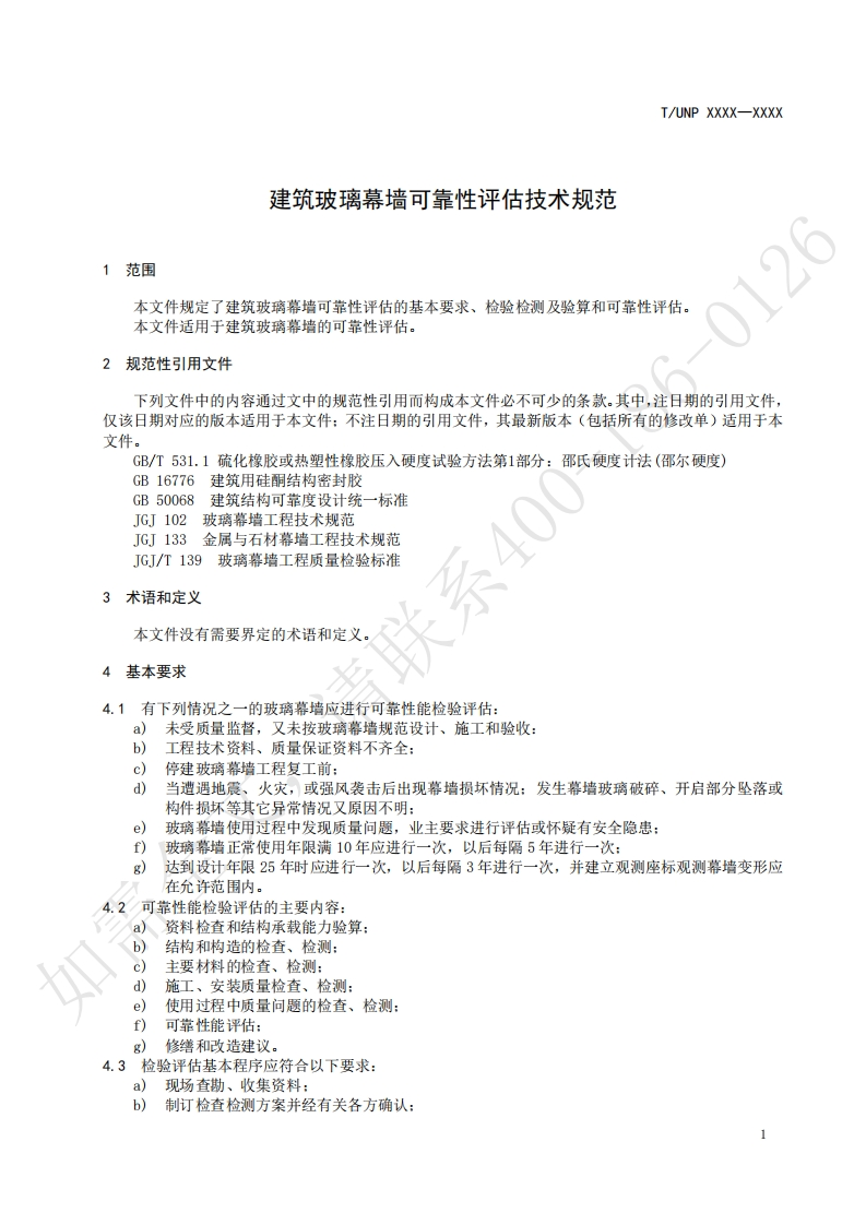 建筑玻璃幕墙可靠性评估技术规范Technicalspecificationforreliabilityassessmentofbuildingglasscurtainwalls请聘348072@abc昨天发布关注私信0.18MB5页034建筑玻璃幕墙可靠性评估技术规范Technicalspecificationforreliabilityassessmentofbuildingglasscurtainwalls请聘此内容为付费资源,请付费后查看¥19¥23黄金会员免费钻石会员免费立即购买您当前未登录!建议登陆后购买,可保存购买订单付费资源 第1页 / 共5页 第2页 / 共5页 第3页 / 共5页 第4页 / 共5页 第5页 / 共5页 已完成全部阅读,共5页 THE END标准规范 文本预览 ICS91.060.10UNSPSC 72.15.14CCSP32UNP团体标准T/UNP XXXX-XXXX建筑玻璃幕墙可靠性评估技术规范Technical specification for reliability assessment of building glass curtain walls请在提交反债意见时,请将您知道的相关专利连同支持性文件一并附上。如需XXXX-Xx-XX发布XXXX-x-XX实施中国联合国采购促进会发布 查看更多 收起部分 喜欢就支持一下吧收藏