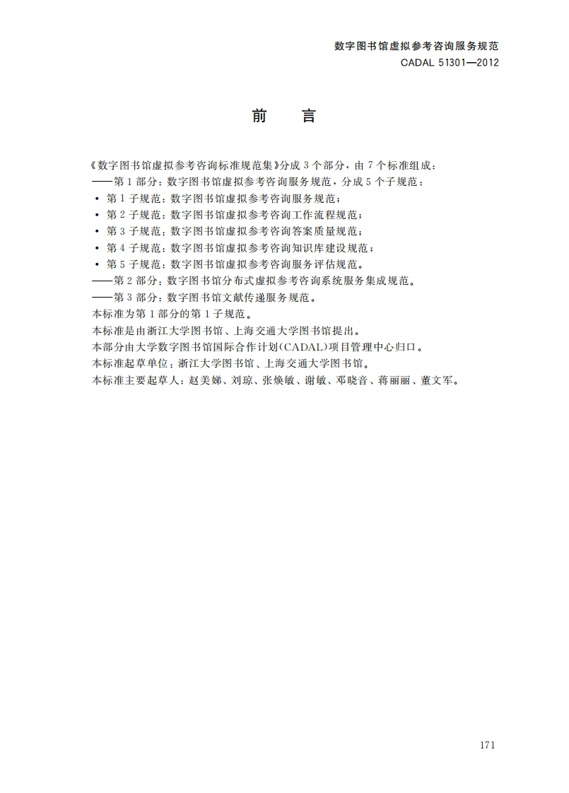 数字图书馆虚拟参考咨询服务规范StandardsforDigitalLibraryVirtuReferenceServiceSpecification第一稿348072@abc2小时前发布关注私信0.69MB12页040数字图书馆虚拟参考咨询服务规范StandardsforDigitalLibraryVirtuReferenceServiceSpecification第一稿此内容为付费资源,请付费后查看¥19¥23黄金会员免费钻石会员免费立即购买您当前未登录!建议登陆后购买,可保存购买订单付费资源 第1页 / 共12页 第2页 / 共12页 第3页 / 共12页 第4页 / 共12页 第5页 / 共12页 试读已结束,还剩7页,您可下载完整版后进行离线阅读 THE END标准规范 文本预览 1CS01.140.20A14C A D AL项目标准CADAL51301-2012数字图书馆虚拟参考咨询服务规范Standards for Digital Library Virtual Reference Service Specification第一稿2012-05-08发布201205-09实施CADAL项目管理中心发布 查看更多 收起部分 喜欢就支持一下吧收藏