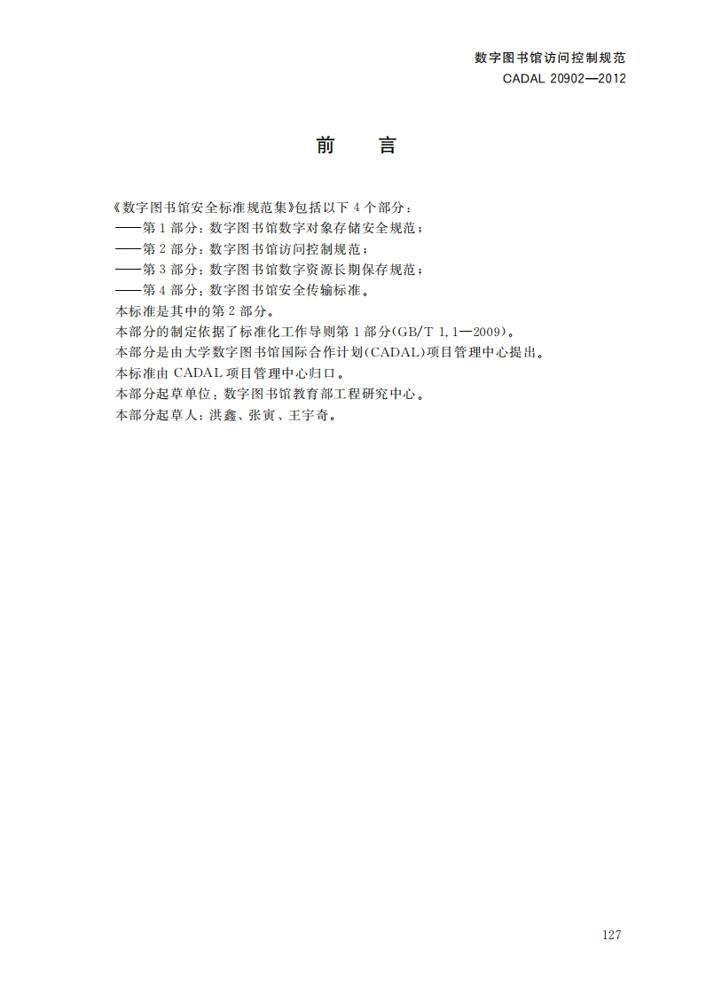 数字图书馆访问控制规范DigitalLibraryAccessontrolSpecification第一稿348072@abc2小时前发布关注私信0.54MB12页035数字图书馆访问控制规范DigitalLibraryAccessontrolSpecification第一稿此内容为付费资源,请付费后查看¥19¥23黄金会员免费钻石会员免费立即购买您当前未登录!建议登陆后购买,可保存购买订单付费资源 第1页 / 共12页 第2页 / 共12页 第3页 / 共12页 第4页 / 共12页 第5页 / 共12页 试读已结束,还剩7页,您可下载完整版后进行离线阅读 THE END标准规范 文本预览 1CS01.140.20A14C A D A L项目标准CADAL20902-2012数字图书馆访问控制规范Digital Library Access Control Specification第一稿2012-05-08发布201205-09实施CADAL项目管理中心发布 查看更多 收起部分 喜欢就支持一下吧收藏