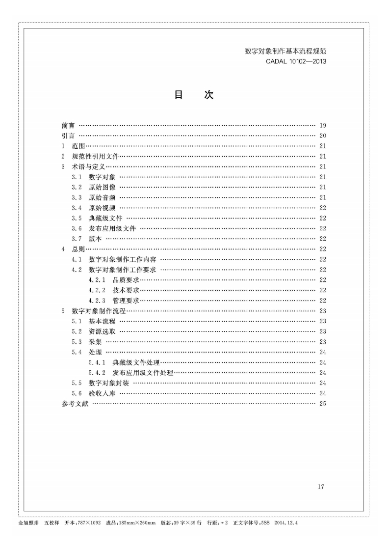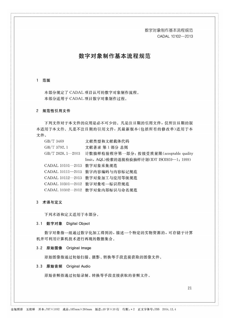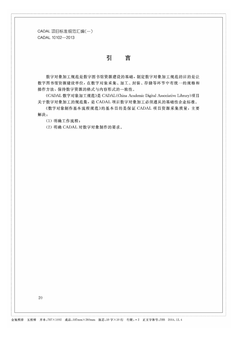 1CS01.140.20A14C A D A L项目标准CADAL10102-2013数字对象制作基本流程规范Specification of Digital Resource Processing第二稿2013-10-152013-10-15发布2013-10-16实施CADAL项目管理中心发布金旭照排五校样开本:787×1092成品:185mm×280mm版芯:39字×39行行距:*2正文字体号:5SS2014.12.4