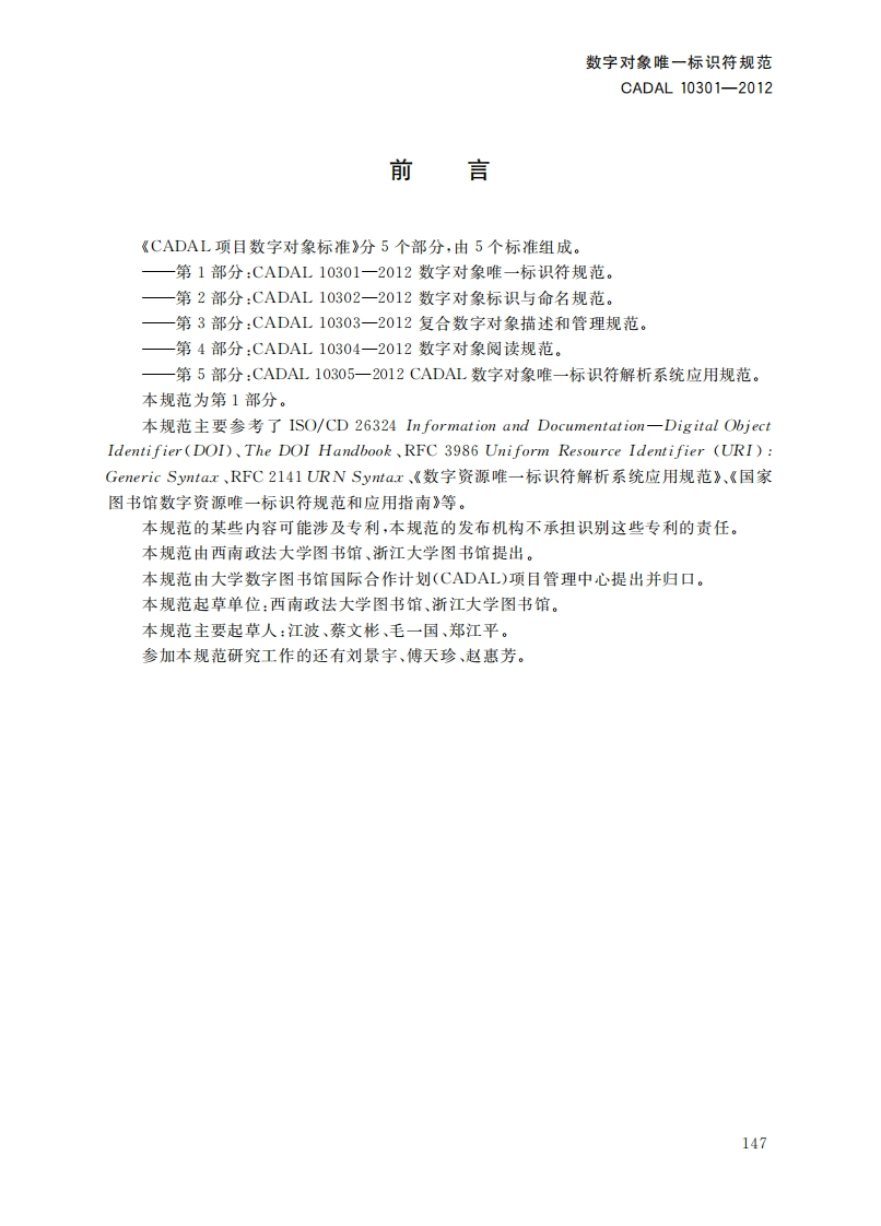 数字对象唯一标识符规范UniqueDigitalObjectIlentifierSpecification第一稿348072@abc4小时前发布关注私信0.69MB13页048数字对象唯一标识符规范UniqueDigitalObjectIlentifierSpecification第一稿此内容为付费资源,请付费后查看¥19¥23黄金会员免费钻石会员免费立即购买您当前未登录!建议登陆后购买,可保存购买订单付费资源 第1页 / 共13页 第2页 / 共13页 第3页 / 共13页 第4页 / 共13页 第5页 / 共13页 试读已结束,还剩8页,您可下载完整版后进行离线阅读 THE END标准规范 文本预览 10S01.140.20A14C A D A L项目标准CADAL10301-2012数字对象唯一标识符规范Unique Digital Object Identifier Specification第一稿201205-08发布2012-0509实施CADAL项目管理中心发布 查看更多 收起部分 喜欢就支持一下吧收藏