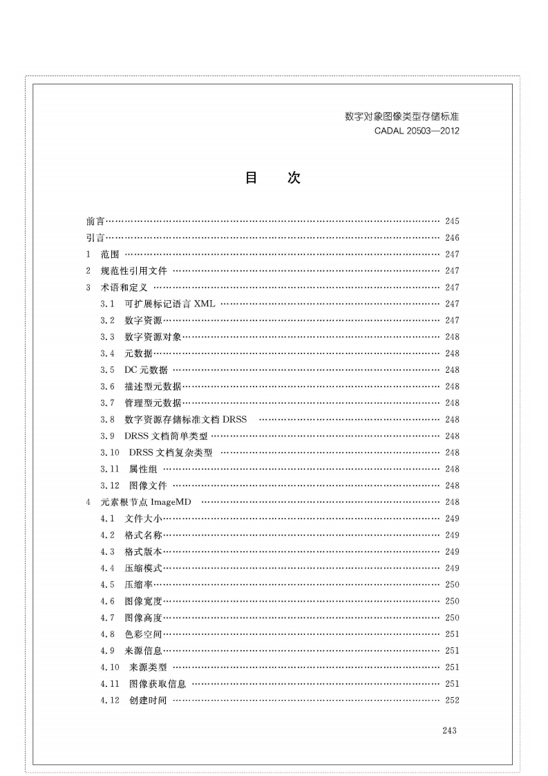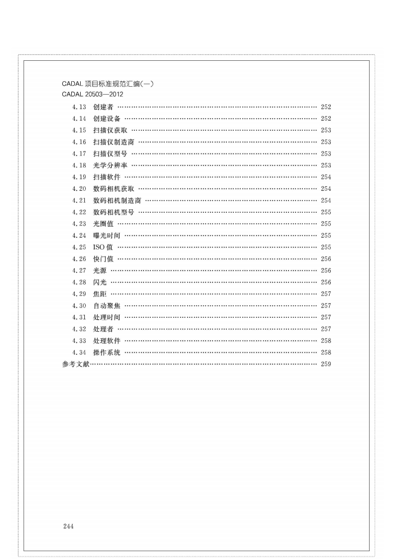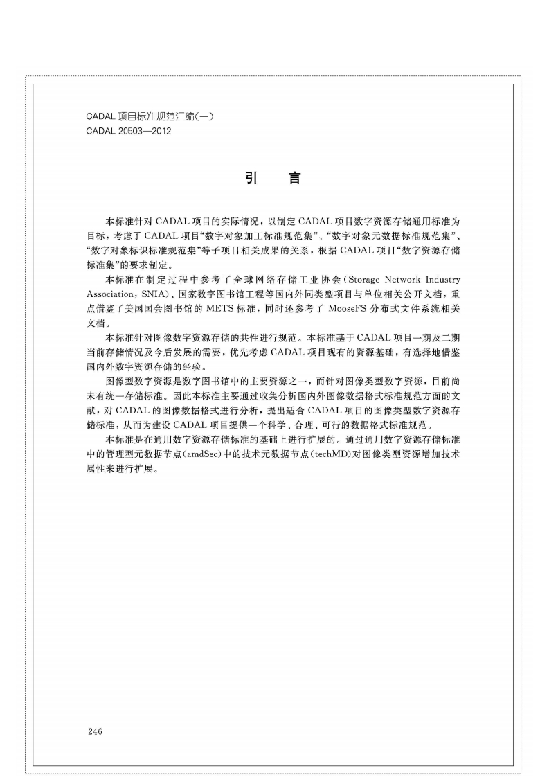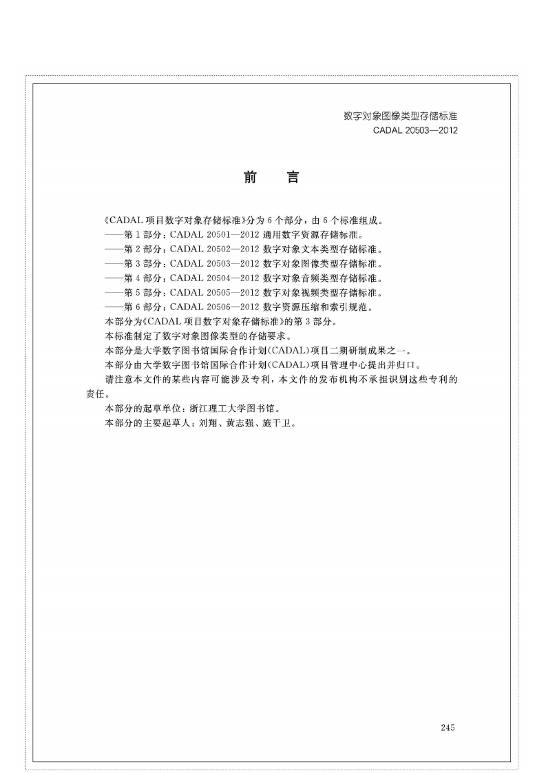 1CS01.140.20A14C A D A L项目标准CADAL20503-2012数字对象图像类型存储标准Standard Specification for Storage of Image-Type Digital Object第一稿2012-05-082012-05-08发布2012-05-09实施CADAL项目管理中心发布金旭照排五校样开本:787×1092成品:185mm×260mm版芯:39字×39行行距:*2正文字体号:5SS2014.12.4