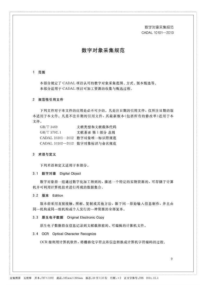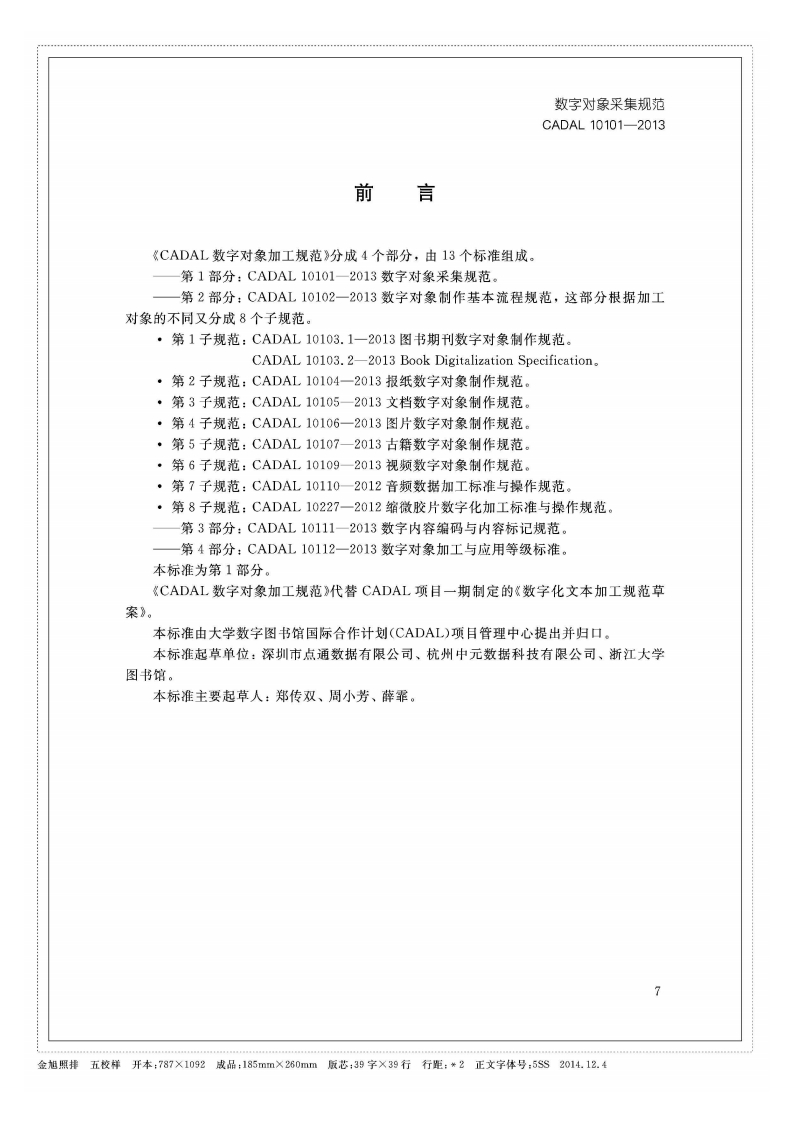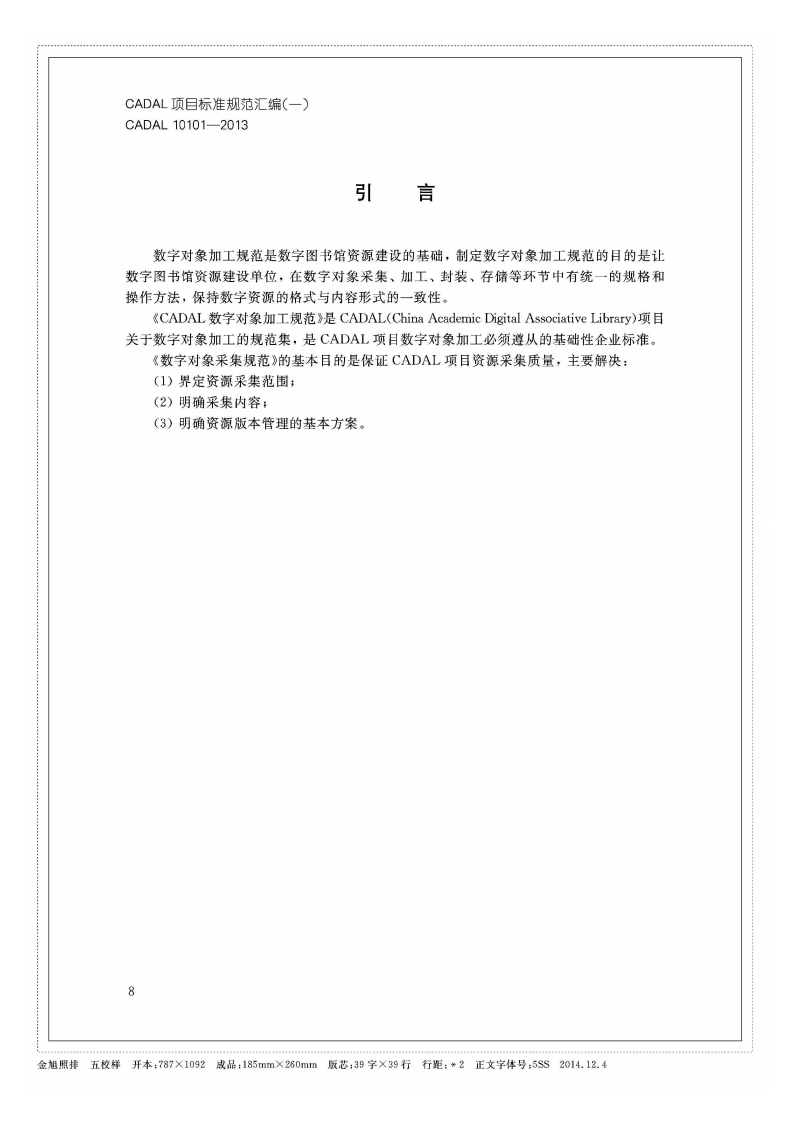 1CS01.140.20A14C A D A L项目标准CADAL10101-2013数字对象采集规范Specification of Digital Resource Collection第二稿2013-10-152013-10-15发布2013-10-16实施CADAL项目管理中心发布金旭照排五校样开本:787×1092咸品:185mm×260mm版芯:39字×39行行距:*2正文字体号:5SS2014.12.4