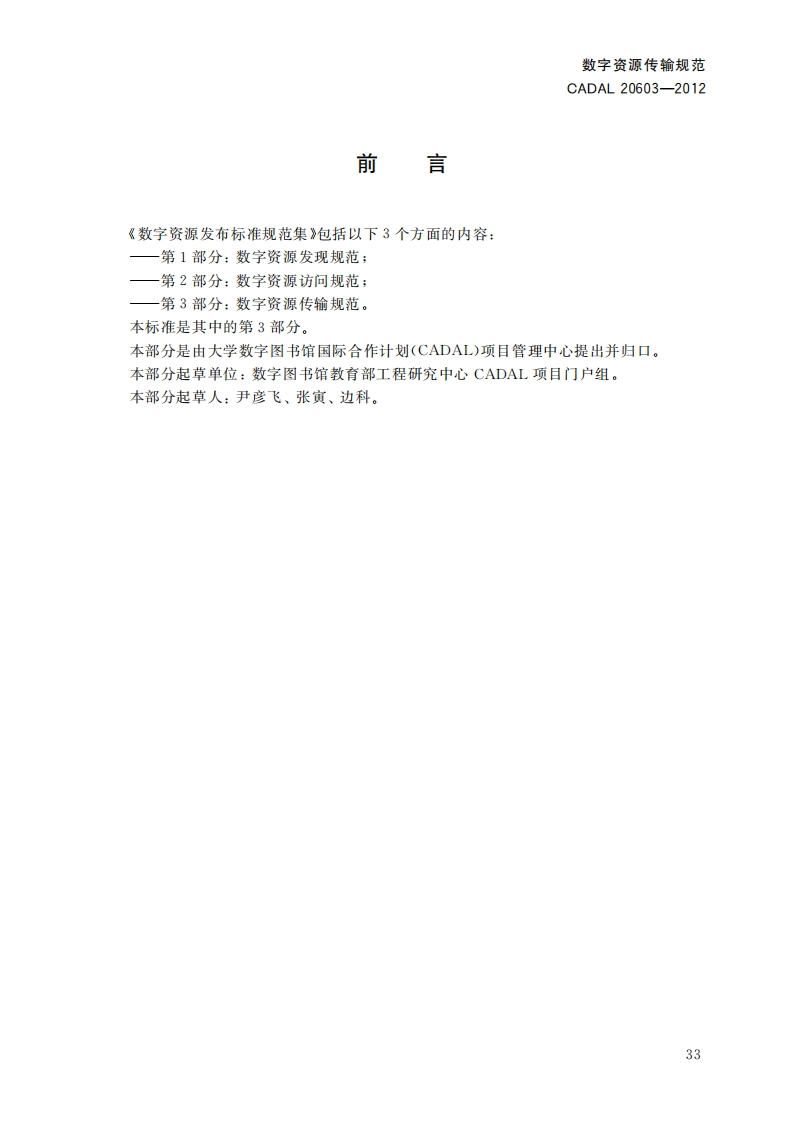 数字资源专输规范DigitalResourcesTransmissionSpecification第一稿348072@abc2小时前发布关注私信0.68MB9页046数字资源专输规范DigitalResourcesTransmissionSpecification第一稿此内容为付费资源,请付费后查看¥19¥23黄金会员免费钻石会员免费立即购买您当前未登录!建议登陆后购买,可保存购买订单付费资源 第1页 / 共9页 第2页 / 共9页 第3页 / 共9页 第4页 / 共9页 第5页 / 共9页 试读已结束,还剩4页,您可下载完整版后进行离线阅读 THE END标准规范 文本预览 1CS01.140.20A14C A D A L项目标准CADAL20603-2012数字资源传输规范Digital Resources Transmission Specification第一稿2012-05-08发布201205-09实施CADAL项目管理中心发布 查看更多 收起部分 喜欢就支持一下吧收藏