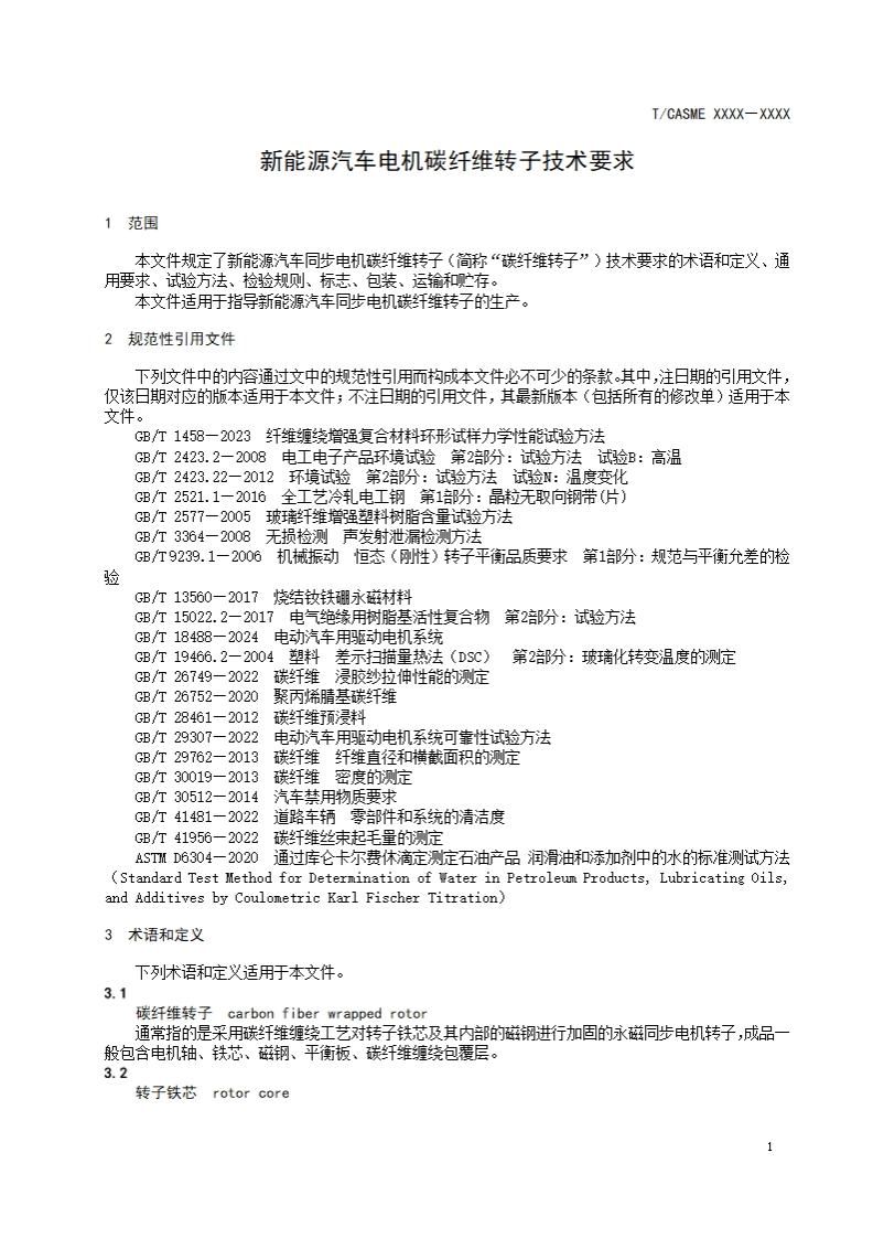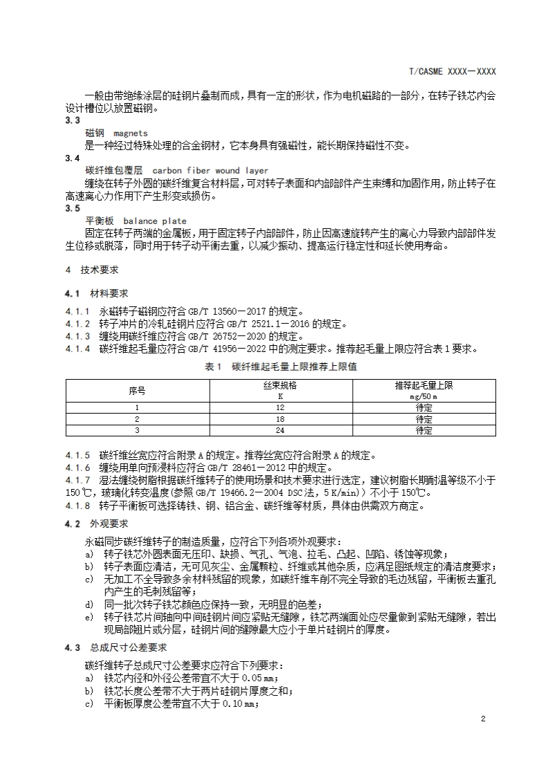 ICS点击此处添加1Cs号CCS点击此处添加cCS号T/CASME团体标准T/CASME XXXX-XXXX新能源汽车电机碳纤维转子技术要求General requirements of carbon fiber wound rotor for new energy vehicle drive motor(征求意见稿)在提交反馈意见时,请将您知道的相联专连同肢持性文件一并附上。XXXX-XX-XX发布XXXX-XX-XX实施中国中小商业企业协会发布