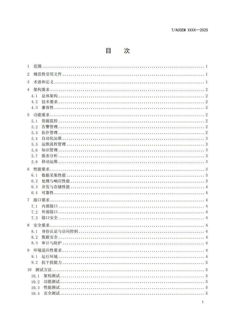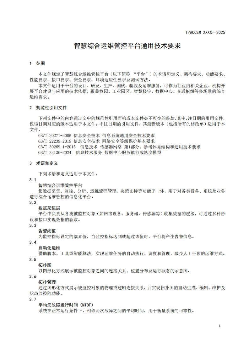 ICS35.020CCS L67VACCME团体标准T/ACCEM XXXX-2025智慧综合运维管控平台通用技术要求General Technical Requirements for Intelligent Integrated Operation andMaintenance Management and Control Platform(征求意见稿)在提交反馈意见时,请将您知道的相关专利连同支持性文件一并附上。2025-Xx-XX发布2025-Xx-XX实施中国商业企业管理协会发布