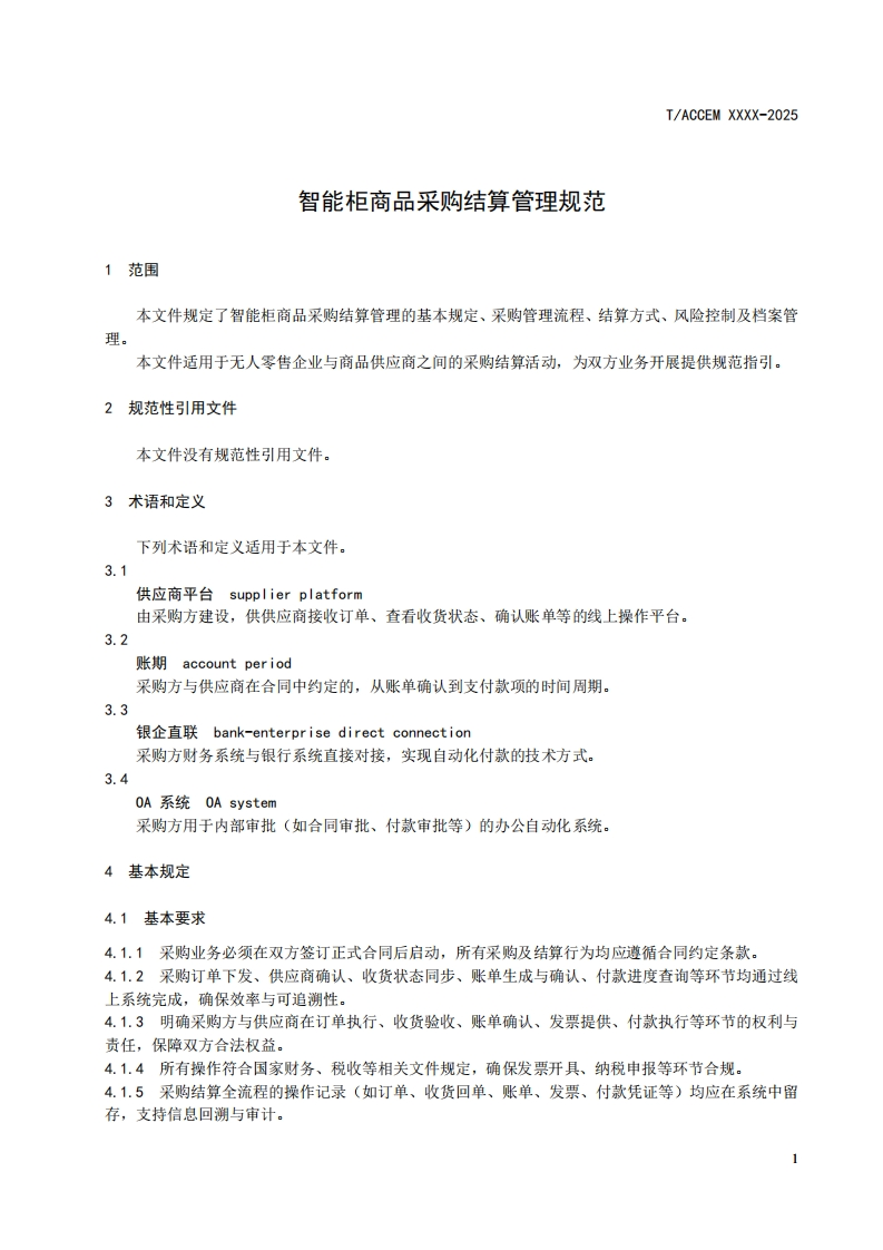 智能柜商品采购结算管理规范Smartcabinetproductpurchaseandsettlementmanagementspecification348072@abc昨天发布关注私信0.23MB10页024智能柜商品采购结算管理规范Smartcabinetproductpurchaseandsettlementmanagementspecification此内容为付费资源,请付费后查看¥19¥23黄金会员免费钻石会员免费立即购买您当前未登录!建议登陆后购买,可保存购买订单付费资源 第1页 / 共10页 第2页 / 共10页 第3页 / 共10页 第4页 / 共10页 第5页 / 共10页 试读已结束,还剩5页,您可下载完整版后进行离线阅读 THE END标准规范 文本预览 ICS03.100.20CCS A 10IACCEM团体标准T/ACCEM XXXX-2025智能柜商品采购结算管理规范Smart cabinet product purchase and settlement management specification(征求意见稿)2025-XX-XX发布2025-XX-XX实施中国商业企业管理协会发布 查看更多 收起部分 喜欢就支持一下吧收藏