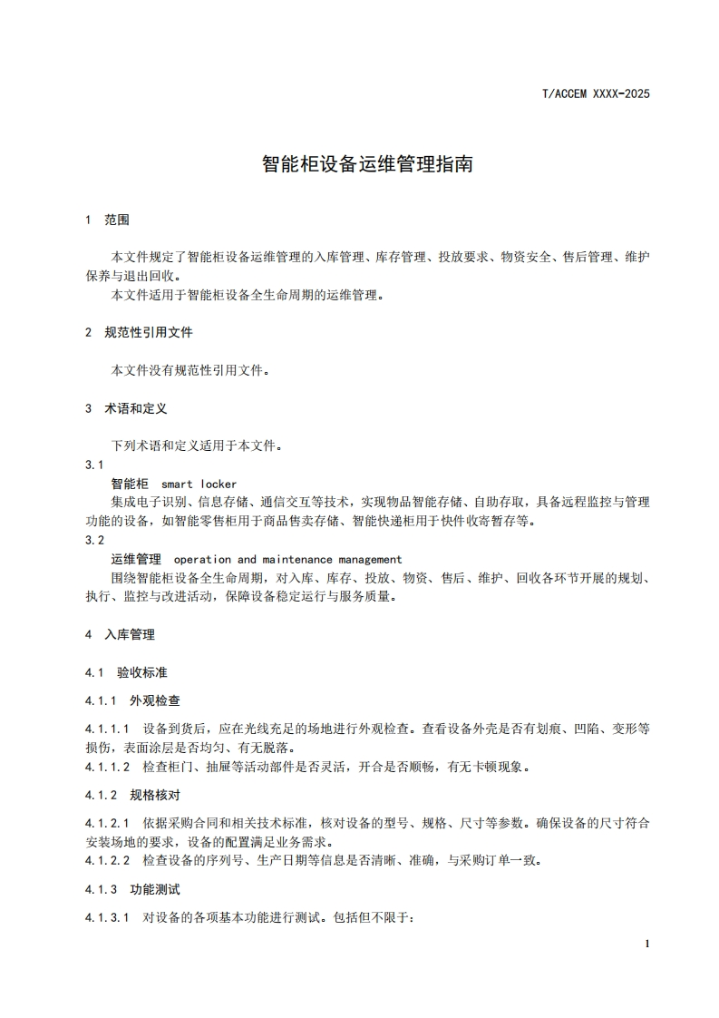 智能柜设备运维管理指南Guidetotheoperationandmaintenancemanagementofsmartcabinetequipment348072@abc昨天发布关注私信0.27MB11页049智能柜设备运维管理指南Guidetotheoperationandmaintenancemanagementofsmartcabinetequipment此内容为付费资源,请付费后查看¥19¥23黄金会员免费钻石会员免费立即购买您当前未登录!建议登陆后购买,可保存购买订单付费资源 第1页 / 共11页 第2页 / 共11页 第3页 / 共11页 第4页 / 共11页 第5页 / 共11页 试读已结束,还剩6页,您可下载完整版后进行离线阅读 THE END标准规范 文本预览 ICS55.230CCSK 60IACCEM团体标准T/ACCEM XXXX-2025智能柜设备运维管理指南Guide to the operation and maintenance management of smart cabinet equipment(征求意见稿)2025-XX-XX发布2025-XX-XX实施中国商业企业管理协会发布 查看更多 收起部分 喜欢就支持一下吧收藏
