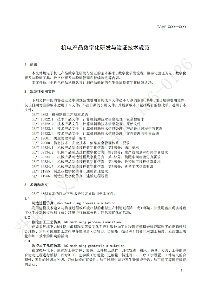ICS03.120.99UNSPSC 81.14.19CCSN10UNP团体标准T/UNP XXXX-XXXX机电产品数字化研发与验证技术规范Technical specification for digital research,development,and verification ofelectromechanical products文请联(草案)(本草案完成时间:)在提交反馈意见时,请将您知道的相关专利连同支持性文件一并附上。获取XXXx-x-XX发布XXXX-x-XX实施中国联合国采购促进会发布