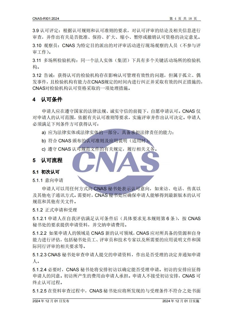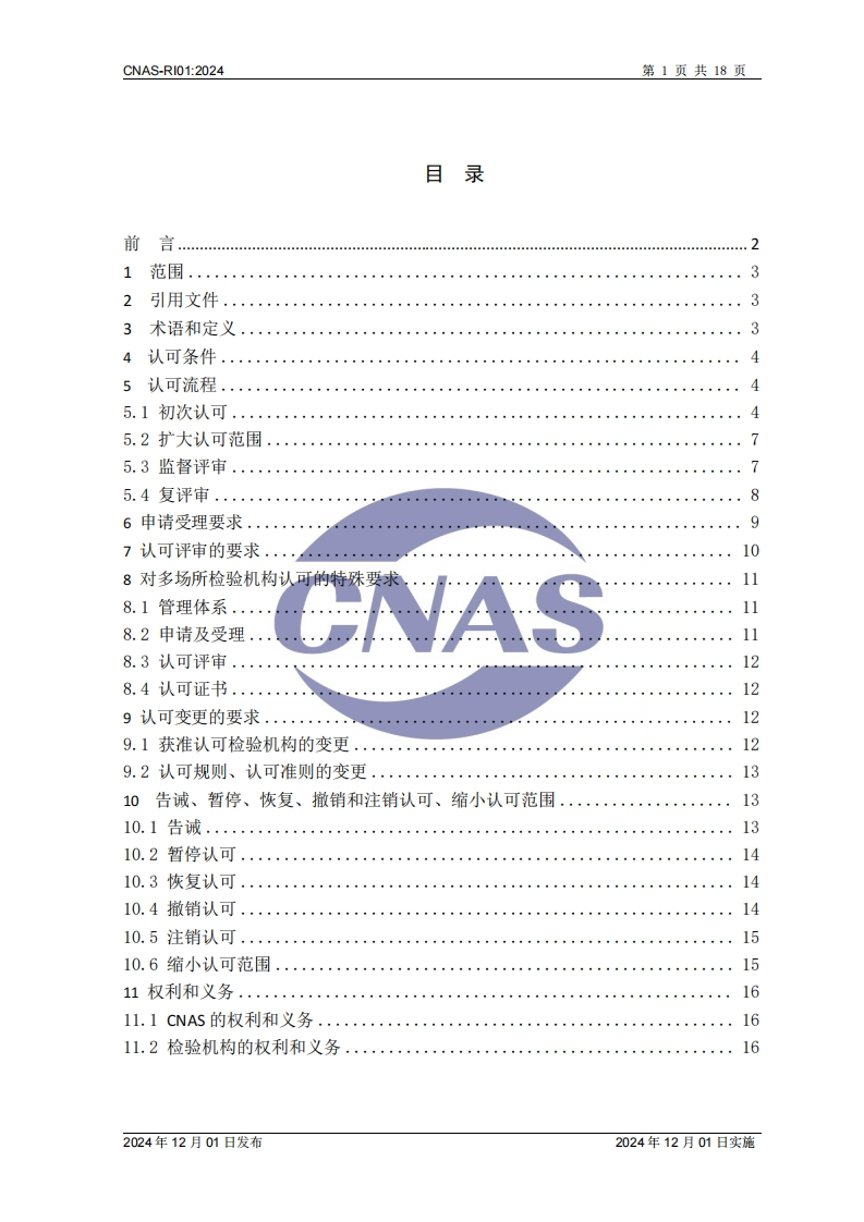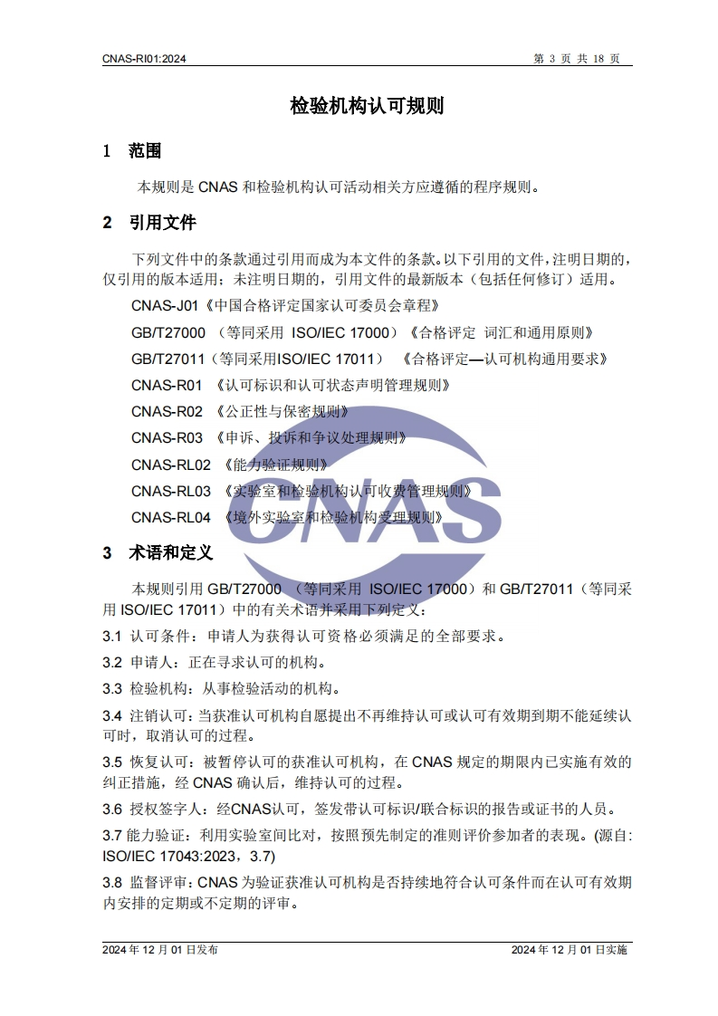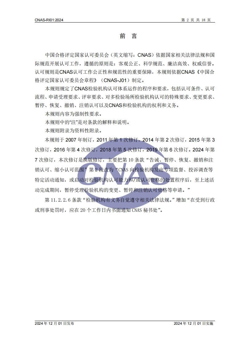 CNASCNAS-RI01检验机构认可规则Rules for the Accreditation of Inspection Bodies版权声明本文件版权归中国合格评定国家认可委员会(CNAS)所有,CNAS对其亭有完全的著作权及与著作权有关的权利。在遵守《中华人民共和国著作权法》及其他相关法律法规的前提下,机构及人员等可免费使用本文件进行非商业性的学习和研究。未经CNAS书面授权准许,禁止任何单位和个人复制、传播、发行、汇编改编、翻译或以其他形式对本文件再创作等,侵权必究。CNAS网站:www.cnas.og.cn中国合格评定国家认可委员会2024年12月01日发布2024年12月01日实施