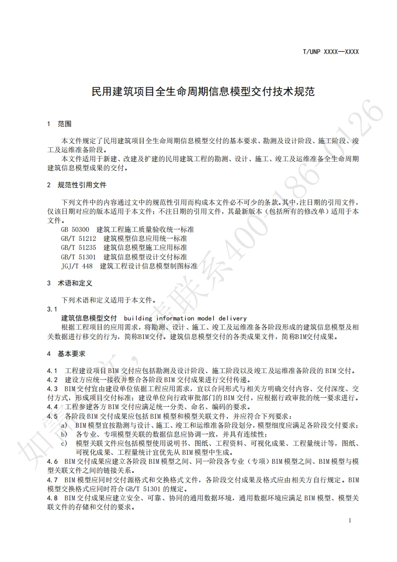 民用建筑项目全生命周期信息模型交付技术规范Technicalspecificationfordeliveryoffulllifecycleinformationmodelofcivilconstructionprojects348072@abc3小时前发布关注私信0.20MB5页024民用建筑项目全生命周期信息模型交付技术规范Technicalspecificationfordeliveryoffulllifecycleinformationmodelofcivilconstructionprojects此内容为付费资源,请付费后查看¥19¥23黄金会员免费钻石会员免费立即购买您当前未登录!建议登陆后购买,可保存购买订单付费资源 第1页 / 共5页 第2页 / 共5页 第3页 / 共5页 第4页 / 共5页 第5页 / 共5页 已完成全部阅读,共5页 THE END标准规范 文本预览 ICS91.020UNSPSC 81.10.15CCSP30UNP团体标准T/UNP XXXX-XXXX民用建筑项目全生命周期信息模型交付技术规范Technical specification for delivery of full life cycle information model of civilconstruction projects在提交反债意见时,请将您知道的相关专利连同支持性文件一并附上。如需XXXx-x-XX发布XXXX-x-XX实施中国联合国采购促进会发布 查看更多 收起部分 喜欢就支持一下吧收藏