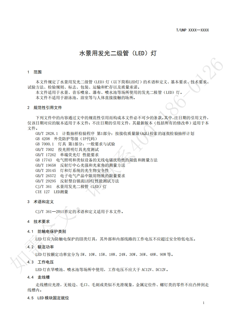 水景用发光二级管(LED)灯Lightemittingdiode(LED)lampusedinwaterscape请联348072@abc3小时前发布关注私信0.30MB10页043水景用发光二级管(LED)灯Lightemittingdiode(LED)lampusedinwaterscape请联此内容为付费资源,请付费后查看¥19¥23黄金会员免费钻石会员免费立即购买您当前未登录!建议登陆后购买,可保存购买订单付费资源 第1页 / 共10页 第2页 / 共10页 第3页 / 共10页 第4页 / 共10页 第5页 / 共10页 试读已结束,还剩5页,您可下载完整版后进行离线阅读 THE END标准规范 文本预览 ICS29.140.99UNSPSC 39.10.16CCSK73UNP团体标准T/UNP XXXX-XXXX水景用发光二级管(LED)灯Light emitting diode(LED)lamp used in waterscape请在提交反债意见时,请将您知道的相关专利连同支持性文件一并附上。如需XXXX-Xx-XX发布XXXX-Xx-XX实施中国联合国采购促进会发布 查看更多 收起部分 喜欢就支持一下吧收藏