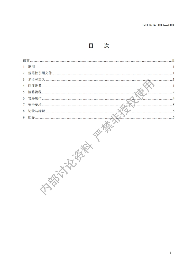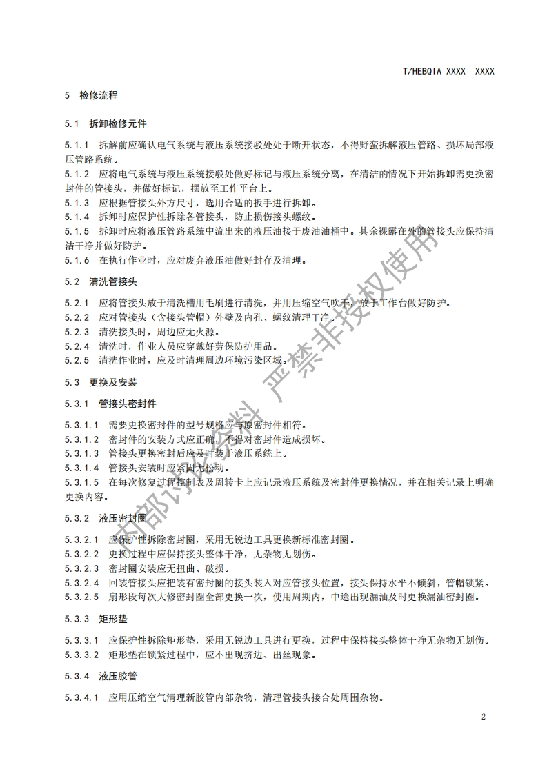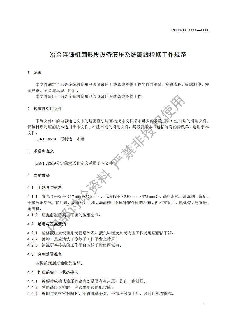 1C523.100CCS J 20T/HEBQIA团体标准T/HEBQIA XXXX-XXXX规使用冶金连铸机扇形段设备液压系统离线检修工作规范Hydraulic system of fan-shaped section equipment of metallurgical continuouscasting machine off-line overhaul work specification内部讨论资料(征求意见稿)2025-XX-XX发布2025-XX-XX实施河北省质量信息协会发布