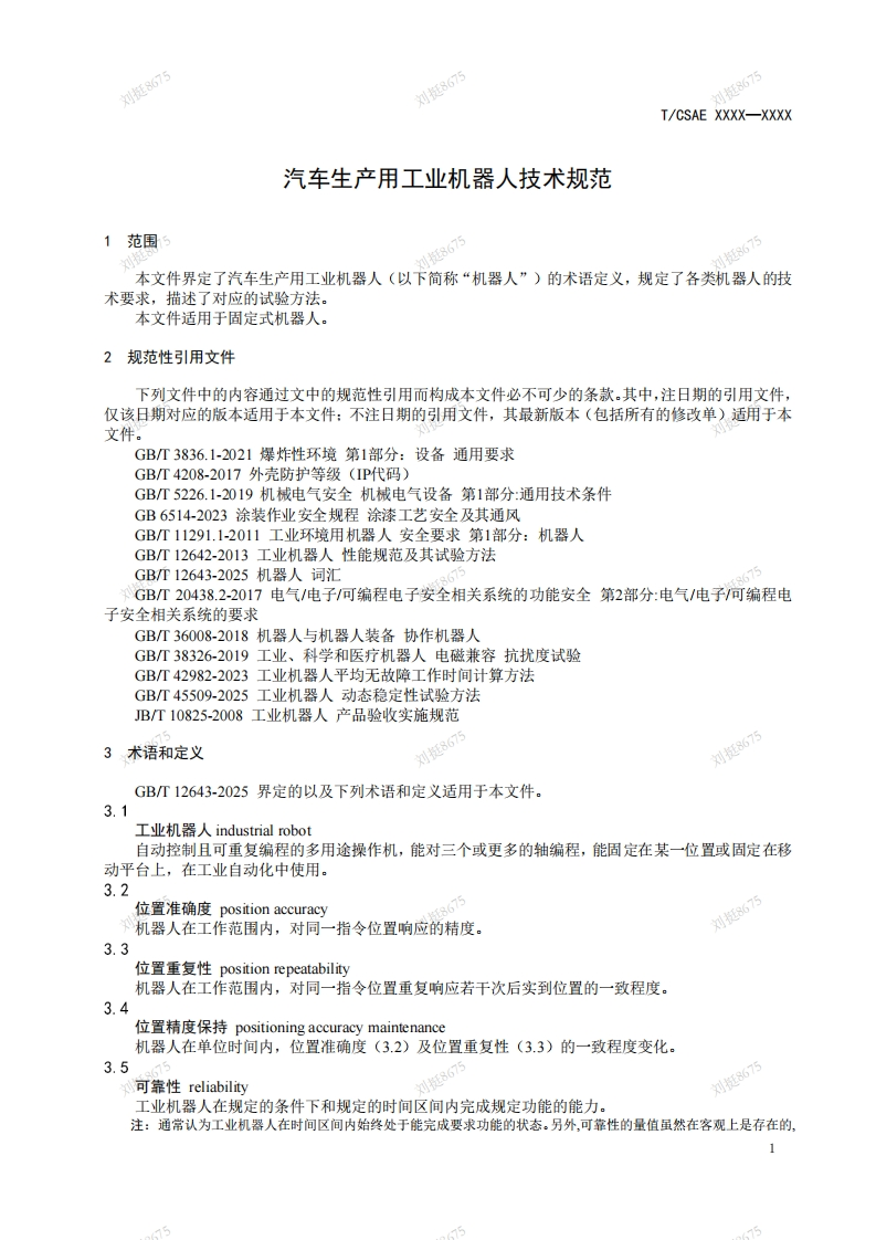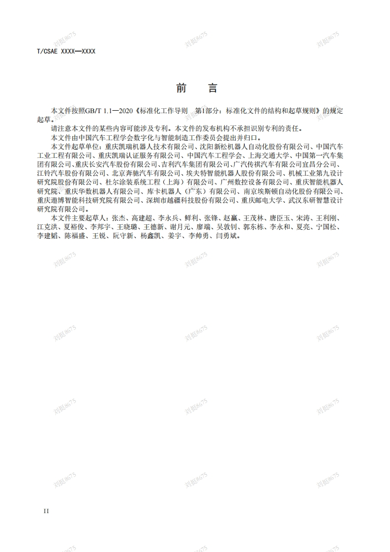 ICS25.040.30CCS J 28刘挺刘挺8675刘挺8675团体标准刘挺8675刘挺8675T/CSAE XXXX--XXXX刘挺8675刘挺8675刘挺8675汽车生产用工业机器人技术规范cchnical specifcations of industial robots for automobile production刘挺80(报批稿)刘挺8675刘挺8675刘挺8675在提交反债意见时,请将您知道的相关专利连同支持性文件一并附上。刘挺8675刘挺8675刘挺8675XXXX-Xx-XX发布XXX-x-X实施刘中国汽车工程学会发布