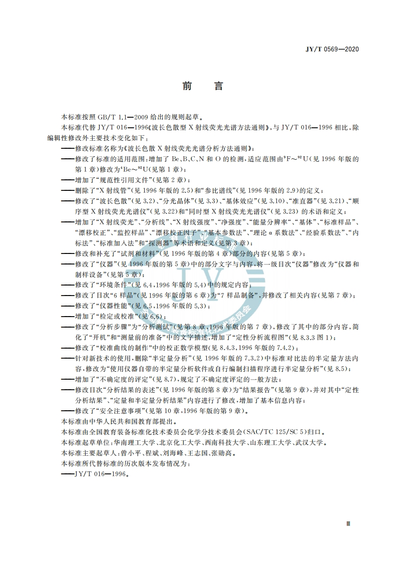 波长色散X射线荧光光谱分析方法通则hGeneralrulesforwavelengthdispersiveX-rayfluorescencespectrometryJY家348072@abc21小时前发布关注私信0.96MB16页033波长色散X射线荧光光谱分析方法通则hGeneralrulesforwavelengthdispersiveX-rayfluorescencespectrometryJY家此内容为付费资源,请付费后查看¥19¥23黄金会员免费钻石会员免费立即购买您当前未登录!建议登陆后购买,可保存购买订单付费资源 第1页 / 共16页 第2页 / 共16页 第3页 / 共16页 第4页 / 共16页 第5页 / 共16页 试读已结束,还剩11页,您可下载完整版后进行离线阅读 THE END标准规范 文本预览 ICS03.180Y51JY中华人民共和国教育行业标准JY/T0569一2020代替JY/T016-1996波长色散X射线荧光光谱分析方法通则标准General rules for wavelength dispersive X-ray fluorescence spectrometryJY月全国教育装备标准化技术委员公2020-09-29发布2020-12-01实施中华人民共和国教育部发布 查看更多 收起部分 喜欢就支持一下吧收藏