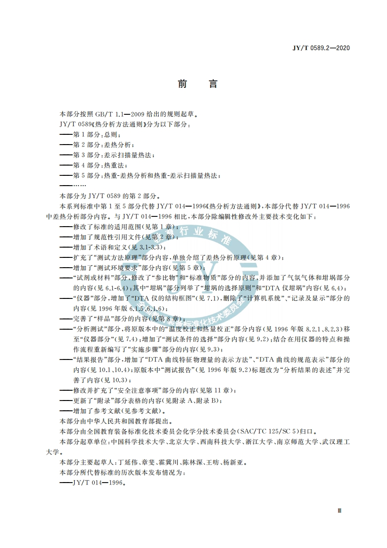 ICS03.180Y51JY中华人民共和国教育行业标准JY/T0589.2-2020代替JY/T014一1996热分析方法通则第2部分:差热分析General rules of analytical methods for thermal analysis-Part 2:Differential thermal analysis全国教育装备标准化技术委员2020-09-29发布2020-12-01实施中华人民共和国教育部发布