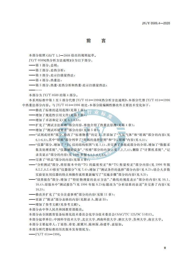 热分析方法通则第4部分_热重法GeneralrulesofanalyticalmethodsforthermalanalysisPart4_Thermogravimetry4我香标准化技大季。348072@abc17小时前发布关注私信0.91MB17页049热分析方法通则第4部分_热重法GeneralrulesofanalyticalmethodsforthermalanalysisPart4_Thermogravimetry4我香标准化技大季。此内容为付费资源,请付费后查看¥19¥23黄金会员免费钻石会员免费立即购买您当前未登录!建议登陆后购买,可保存购买订单付费资源 第1页 / 共17页 第2页 / 共17页 第3页 / 共17页 第4页 / 共17页 第5页 / 共17页 试读已结束,还剩12页,您可下载完整版后进行离线阅读 THE END标准规范 文本预览 ICS03.180Y51JY中华人民共和国教育行业标准JY/T0589.4一2020代替JY/T014-1996热分析方法通则第4部分:热重法T YGeneral rules of analytical methods for thermal analysis-Part 4:Thermogravimetry全国教育装备标准化技术委员公2020-09-29发布2020-12-01实施中华人民共和国教育部发布 查看更多 收起部分 喜欢就支持一下吧收藏