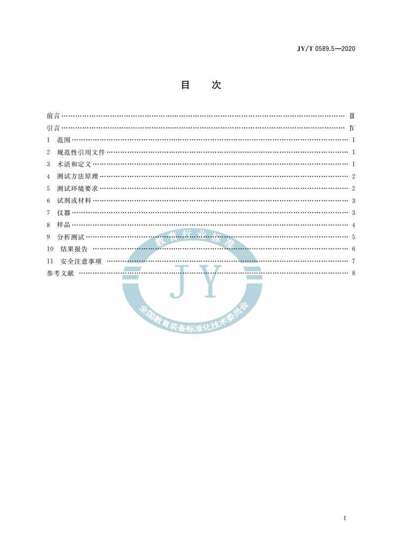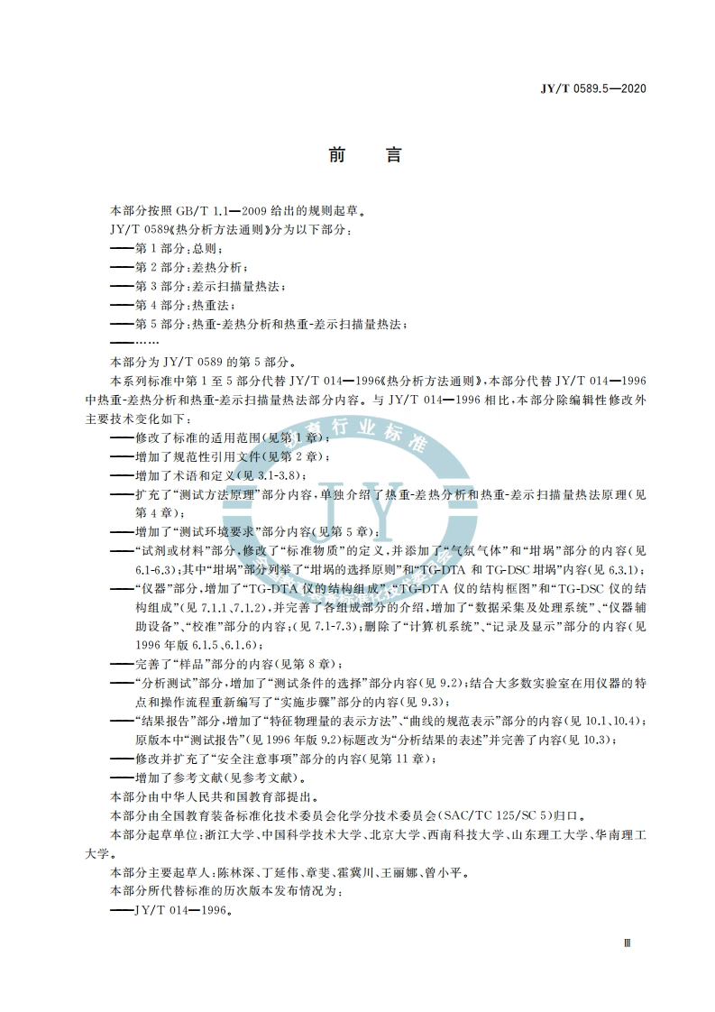 1CS03.180Y51JY中华人民共和国教育行业标准JY/T0589.5-2020代替JY/T014一1996热分析方法通则第5部分:热重-差热分析和热重-差示扫描量热法。General rules of analytical methods for thermal analysis-Part 5:Simulateneous thermogravimetric-differential thermal analysisand thermogravimetric-differential scanning calorimetry2020-09-29发布2020-12-01实施中华人民共和国教育部发布