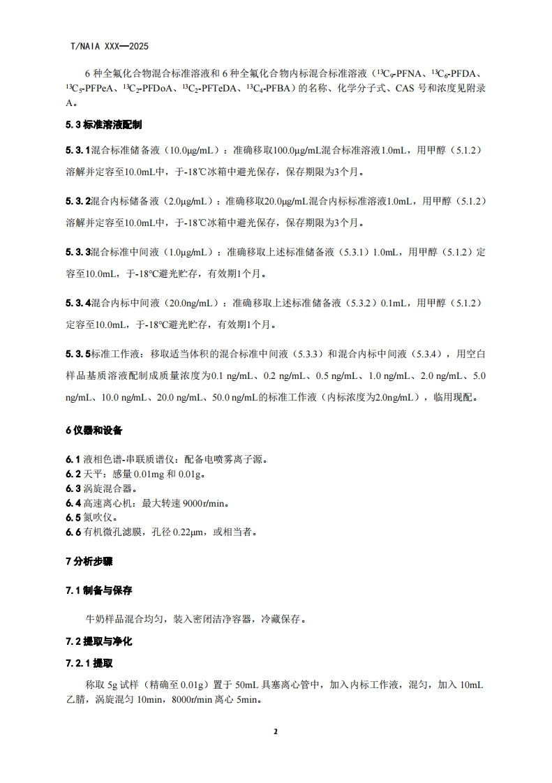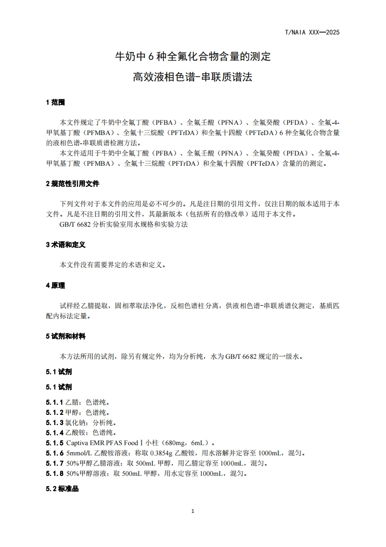 牛奶中6种全氟化合物含量的测定高效液相色谱-串联质谱法DeterminationofSixPerfluorinatedCompoundsinMilkbyHPLC-MS_MS348072@abc15小时前发布关注私信0.81MB10页050牛奶中6种全氟化合物含量的测定高效液相色谱-串联质谱法DeterminationofSixPerfluorinatedCompoundsinMilkbyHPLC-MS_MS此内容为付费资源,请付费后查看¥19¥23黄金会员免费钻石会员免费立即购买您当前未登录!建议登陆后购买,可保存购买订单付费资源 第1页 / 共10页 第2页 / 共10页 第3页 / 共10页 第4页 / 共10页 第5页 / 共10页 试读已结束,还剩5页,您可下载完整版后进行离线阅读 THE END标准规范 文本预览 1c867.100c03c144TNAIA团体标准T/NAIA XXX-2025牛奶中6种全氟化合物含量的测定高效液相色谱-串联质谱法Determination of Six Perfluorinated Compounds in Milk byHPLC-MS/MS2025-XX-XX发布2025-XX-XX实施宁夏化学分析测试协会发布 查看更多 收起部分 喜欢就支持一下吧收藏