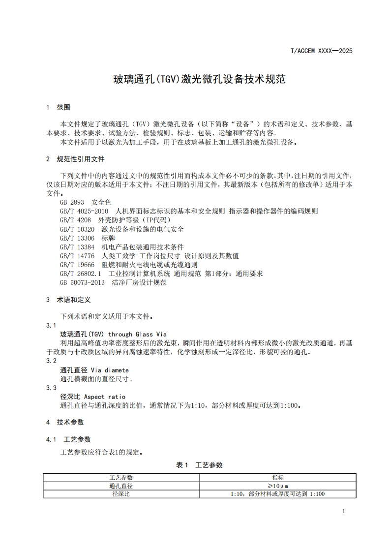 玻璃通孔(TGV)激光微孔设备技术规范Through-glassvia(tgv)lasermicro-drillingequipmenttechnicalspecification348072@abc15小时前发布关注私信0.21MB8页045玻璃通孔(TGV)激光微孔设备技术规范Through-glassvia(tgv)lasermicro-drillingequipmenttechnicalspecification此内容为付费资源,请付费后查看¥19¥23黄金会员免费钻石会员免费立即购买您当前未登录!建议登陆后购买,可保存购买订单付费资源 第1页 / 共8页 第2页 / 共8页 第3页 / 共8页 第4页 / 共8页 第5页 / 共8页 试读已结束,还剩3页,您可下载完整版后进行离线阅读 THE END标准规范 文本预览 ICS31.260CCS L51T/ACCEM团体标准T/ACCEM XXXX-2025玻璃通孔(TGV)激光微孔设备技术规范Through-glass via(tgv)laser micro-drilling equipment technical specification(征求意见稿)2025-Xx-XX发布2025-Xx-XX实施中国商业企业管理协会发布 查看更多 收起部分 喜欢就支持一下吧收藏