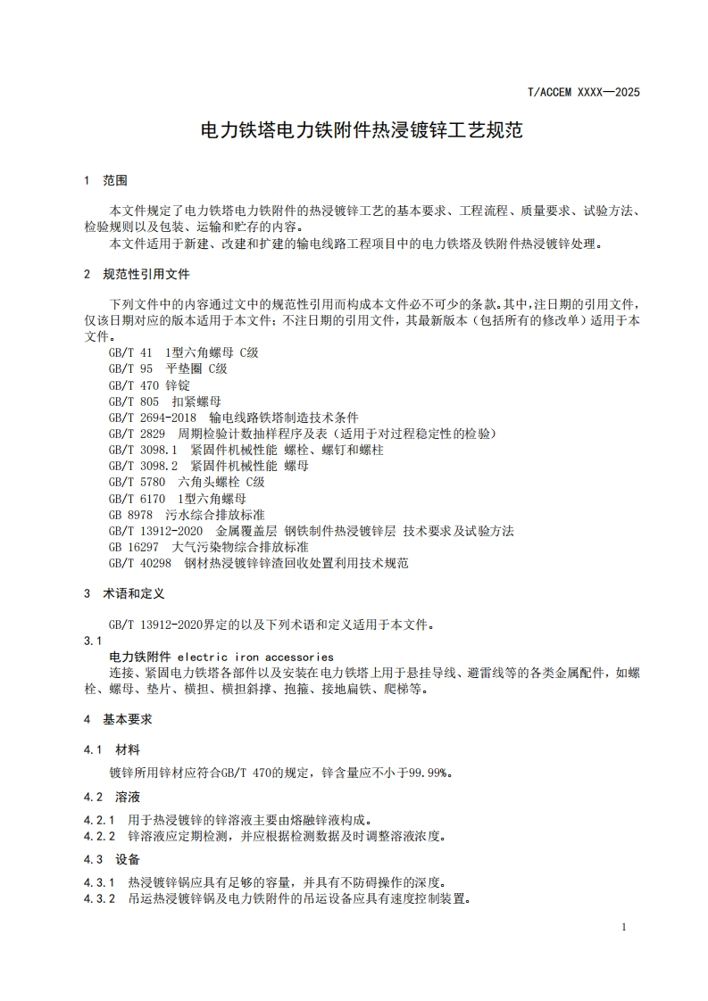 电力铁塔电力铁附件热浸镀锌工艺规范Hot-dipgalvanizingprocessspecificationforpowertowerandpowerironaccessories348072@abc13小时前发布关注私信0.24MB10页048电力铁塔电力铁附件热浸镀锌工艺规范Hot-dipgalvanizingprocessspecificationforpowertowerandpowerironaccessories此内容为付费资源,请付费后查看¥19¥23黄金会员免费钻石会员免费立即购买您当前未登录!建议登陆后购买,可保存购买订单付费资源 第1页 / 共10页 第2页 / 共10页 第3页 / 共10页 第4页 / 共10页 第5页 / 共10页 试读已结束,还剩5页,您可下载完整版后进行离线阅读 THE END标准规范 文本预览 ICS25.220.40CCS A29T/ACCEM团体标准T/ACCEM XXXX-2025电力铁塔电力铁附件热浸镀锌工艺规范Hot-dip galvanizing process specification for power tower and power iron accessories(征求意见稿)2025-Xx-XX发布2025-Xx-XX实施中国商业企业管理协会发布 查看更多 收起部分 喜欢就支持一下吧收藏