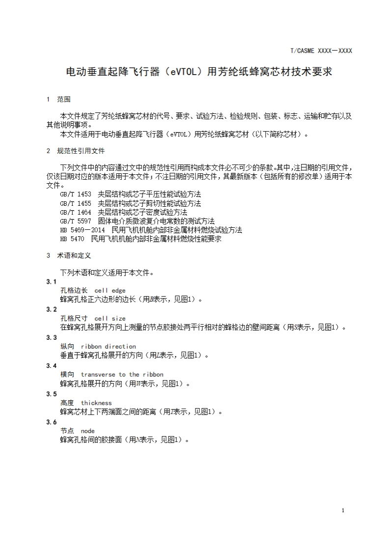 ICS49.025.01CCS C 374T/CASME团体标准T/CASME XXXX-XXXX电动垂直起降飞行器(eVT0L)用芳纶纸蜂窝芯材技术要求Specification for aramid paper honeycomb core material for eVTOL applications(征求意见稿)在提交反馈意见时,请将您知道的相联专利链同肢持性文件一并附上。XXXX-XX-XX发布XXXX-XX-XX实施中国中小商业企业协会发布