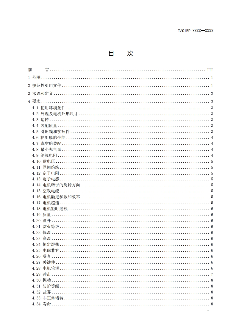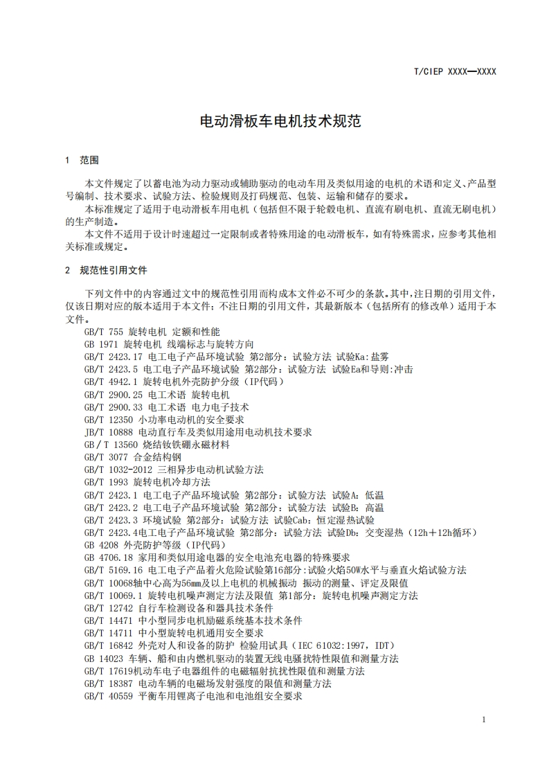 电动滑板车电机技术规范ElectricScooterMotorTechnicalSpecification348072@abc12小时前发布关注私信0.36MB17页047电动滑板车电机技术规范ElectricScooterMotorTechnicalSpecification此内容为付费资源,请付费后查看¥19¥23黄金会员免费钻石会员免费立即购买您当前未登录!建议登陆后购买,可保存购买订单付费资源 第1页 / 共17页 第2页 / 共17页 第3页 / 共17页 第4页 / 共17页 第5页 / 共17页 试读已结束,还剩12页,您可下载完整版后进行离线阅读 THE END标准规范 文本预览 ICS29.160.30CCS K 24I/CIEP中国工业环促进会团体标准T/CIEP XXXX-XXXX电动滑板车电机技术规范Electric Scooter Motor Technical SpecificationXXXX-Xx-XX发布XXXX-Xx-XX实施中国工业环保促进会发布 查看更多 收起部分 喜欢就支持一下吧收藏
