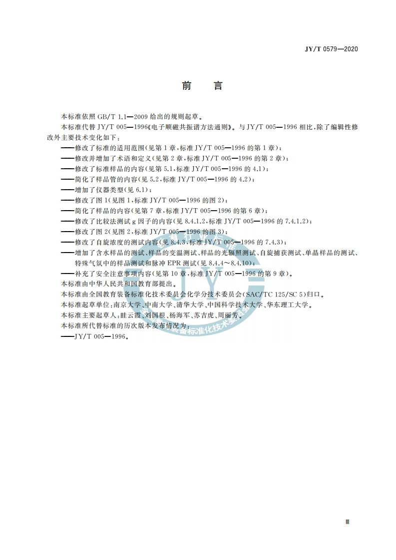 电子顺磁共振波谱分析方法通则Generalrulesofanalyticalmethodsforelectronparamagneticresonancespectroscopy教育装备标性化安348072@abc10小时前发布关注私信0.95MB15页035电子顺磁共振波谱分析方法通则Generalrulesofanalyticalmethodsforelectronparamagneticresonancespectroscopy教育装备标性化安此内容为付费资源,请付费后查看¥19¥23黄金会员免费钻石会员免费立即购买您当前未登录!建议登陆后购买,可保存购买订单付费资源 第1页 / 共15页 第2页 / 共15页 第3页 / 共15页 第4页 / 共15页 第5页 / 共15页 试读已结束,还剩10页,您可下载完整版后进行离线阅读 THE END标准规范 文本预览 1CS03.180Y51JY中华人民共和国教育行业标准JY/T0579一2020代替JY/T005-1996电子顺磁共振波谱分析方法通则教自General rules of analytical methods for electron paramagneticresonance spectroscopy全国教育装备标准化技术委员么人2020-09-29发布2020-12-01实施中华人民共和国教育部发布 查看更多 收起部分 喜欢就支持一下吧收藏