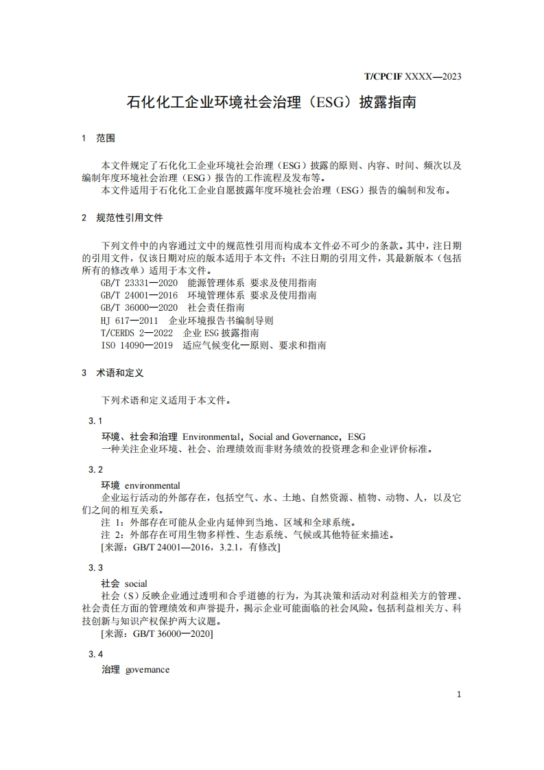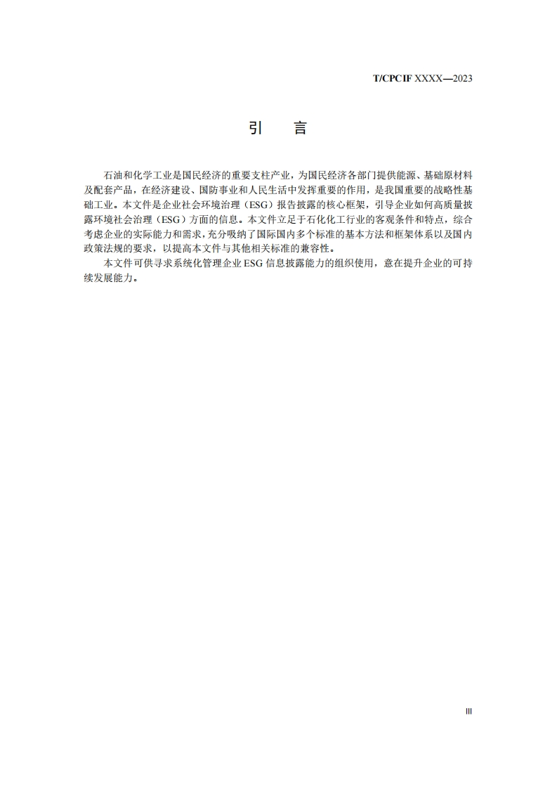 ICS13.020CCS Z 04CPCIF中国石油和化学工业联合会团体标准T/CPCIF XXXXX-202X石化化工企业环境社会治理(ESG)披露指南Disclosure guidelines to the environment social governance (ESG)forpetrochemical and chemical enterprise(征求意见稿)202X-XX-XX发布202X-XX-XX实施中国石油和化学工业联合会发布