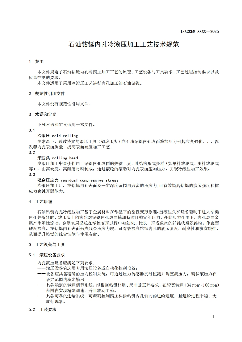 石油钻铤内孔冷滚压加工工艺技术规范Technicalspecificationforcoldrollingprocessofinnerholeofoildrillcollar348072@abc8小时前发布关注私信0.24MB9页047石油钻铤内孔冷滚压加工工艺技术规范Technicalspecificationforcoldrollingprocessofinnerholeofoildrillcollar此内容为付费资源,请付费后查看¥19¥23黄金会员免费钻石会员免费立即购买您当前未登录!建议登陆后购买,可保存购买订单付费资源 第1页 / 共9页 第2页 / 共9页 第3页 / 共9页 第4页 / 共9页 第5页 / 共9页 试读已结束,还剩4页,您可下载完整版后进行离线阅读 THE END标准规范 文本预览 ICS75.180.10CCS E92T/ACCEM团体标准T/ACCEM XXXX-2025石油钻铤内孔冷滚压加工工艺技术规范Technical specification for cold rolling process of inner hole of oil drill collar(征求意见稿)2025-Xx-XX发布2025-Xx-XX实施中国商业企业管理协会发布 查看更多 收起部分 喜欢就支持一下吧收藏