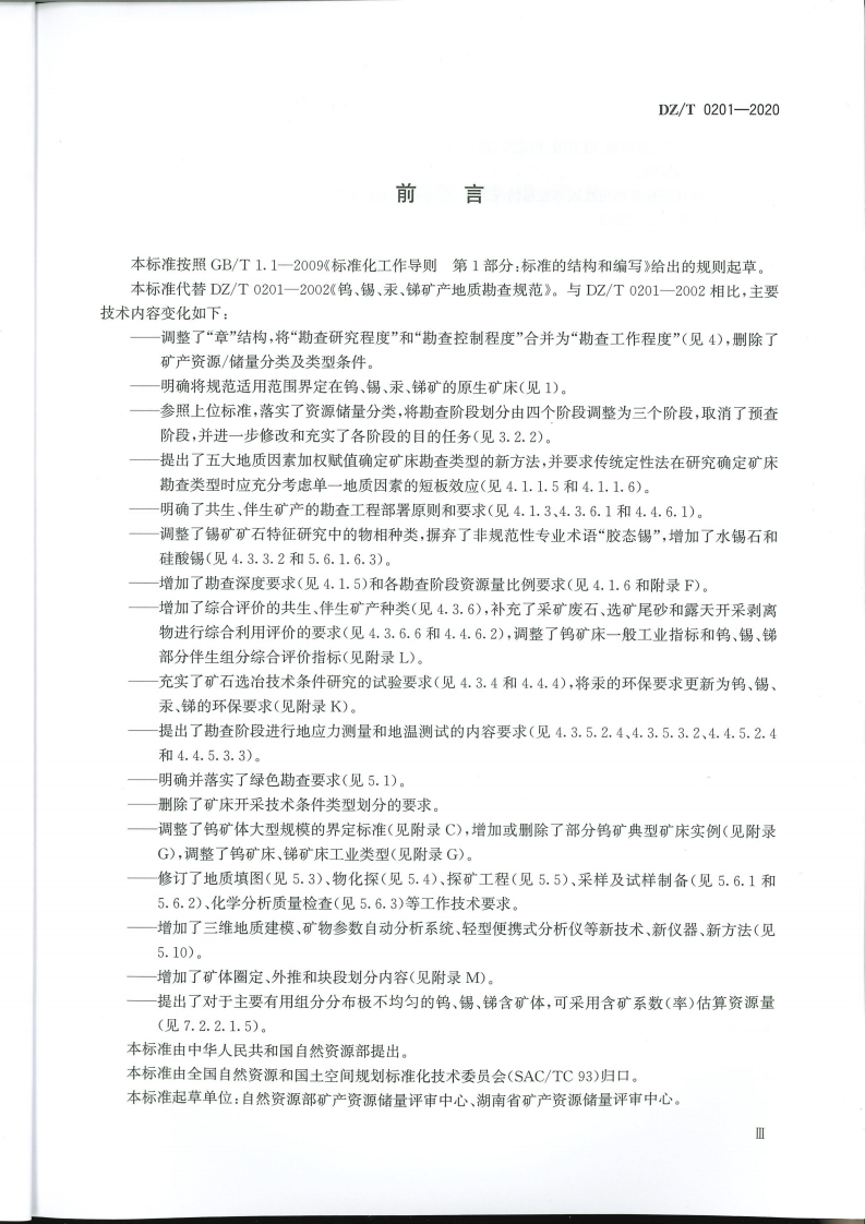 ICS73.020;73.060.01D120z中华人民共和国地质矿产行业标准DZ/T0201-2020代替DZ/T0201-2002矿产地质勘查规范钨、锡、汞、锑Specifications for tungsten,tin,mercury and antimony mineral exploration2020-04-30发布2020-04-30实施中华人民共和国自然资源部发布