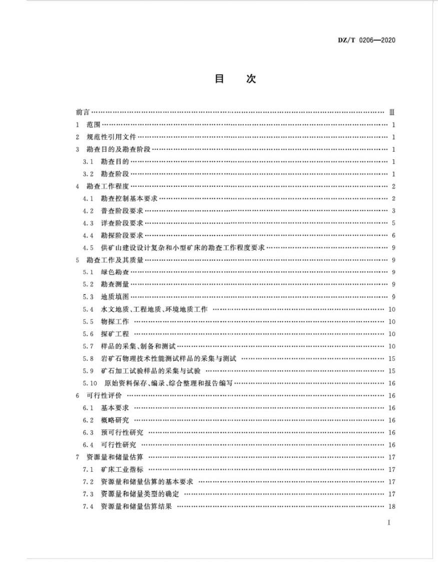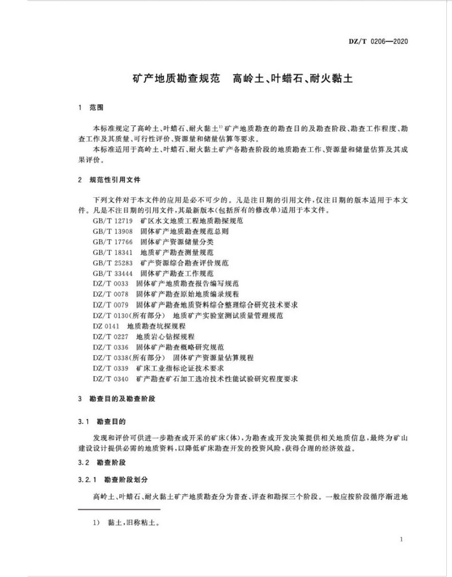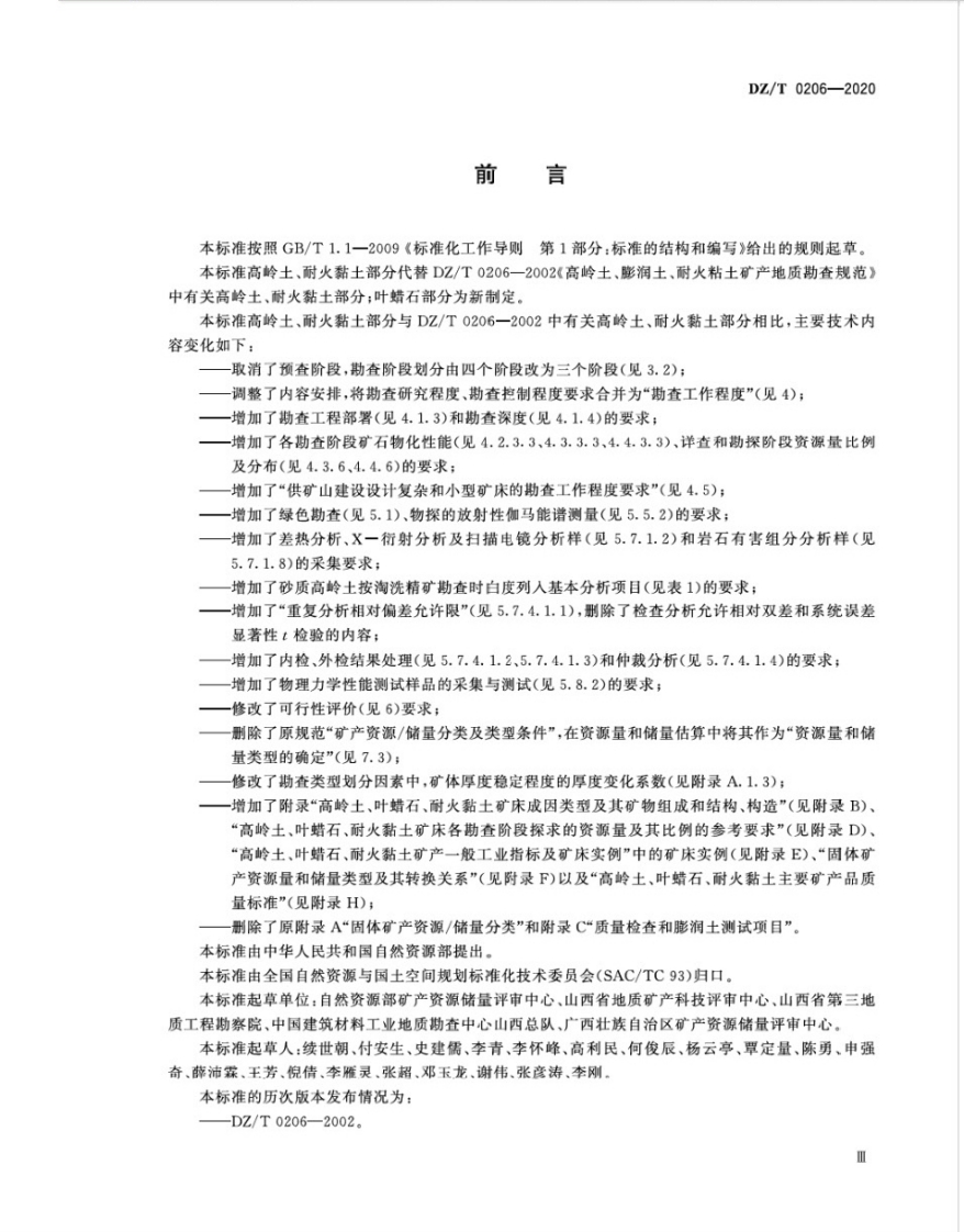 ICS73.020:73.080D1302中华人民共和国地质矿产行业标准DZ/T0206-2020代替D2/T0206一2302中高龄土、耐火黏土部分,叶蜡石部分为新制定矿产地质勘查规范高岭土、叶蜡石、耐火黏土Specifications for kaolin,pyrophyllite,refractory-clay mineral exploration2020-04-30发布2020-04-30实施中华人民共和国自然资源部发布