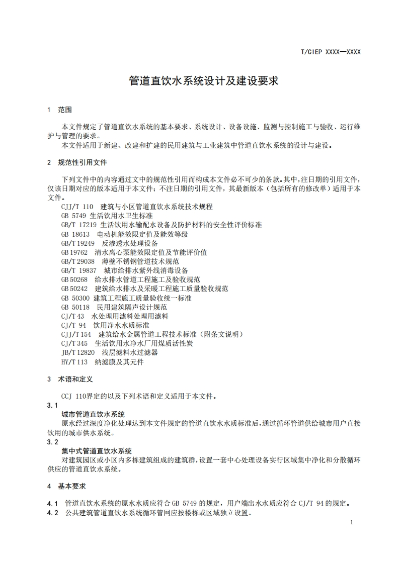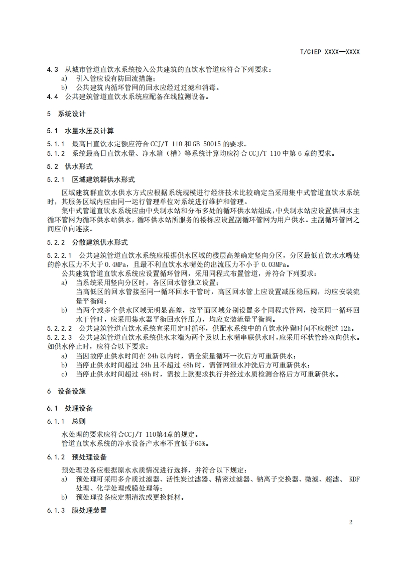 管道直饮水系统设计及建设要求Designandconstructionrequirementsforpipelinedirectdrinkingwatersystems348072@abc3小时前发布关注私信0.29MB10页038管道直饮水系统设计及建设要求Designandconstructionrequirementsforpipelinedirectdrinkingwatersystems此内容为付费资源,请付费后查看¥19¥23黄金会员免费钻石会员免费立即购买您当前未登录!建议登陆后购买,可保存购买订单付费资源 第1页 / 共10页 第2页 / 共10页 第3页 / 共10页 第4页 / 共10页 第5页 / 共10页 试读已结束,还剩5页,您可下载完整版后进行离线阅读 THE END标准规范 文本预览 ICS91.140.60CCS P 41TCIEP中国工业环保促进会团体标准T/CIEP XXXX-XXXX管道直饮水系统设计及建设要求Design and construction requirements for pipeline direct drinking water systems(工作组讨论稿)XXXX-Xx-XX发布XXXX-Xx-XX实施中国工业环保促进会发布 查看更多 收起部分 喜欢就支持一下吧收藏
