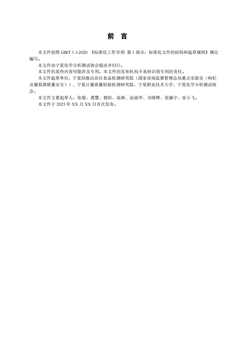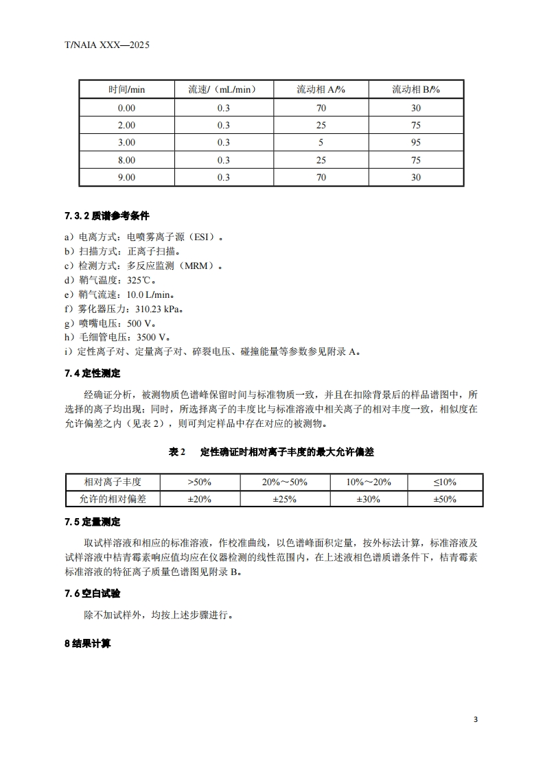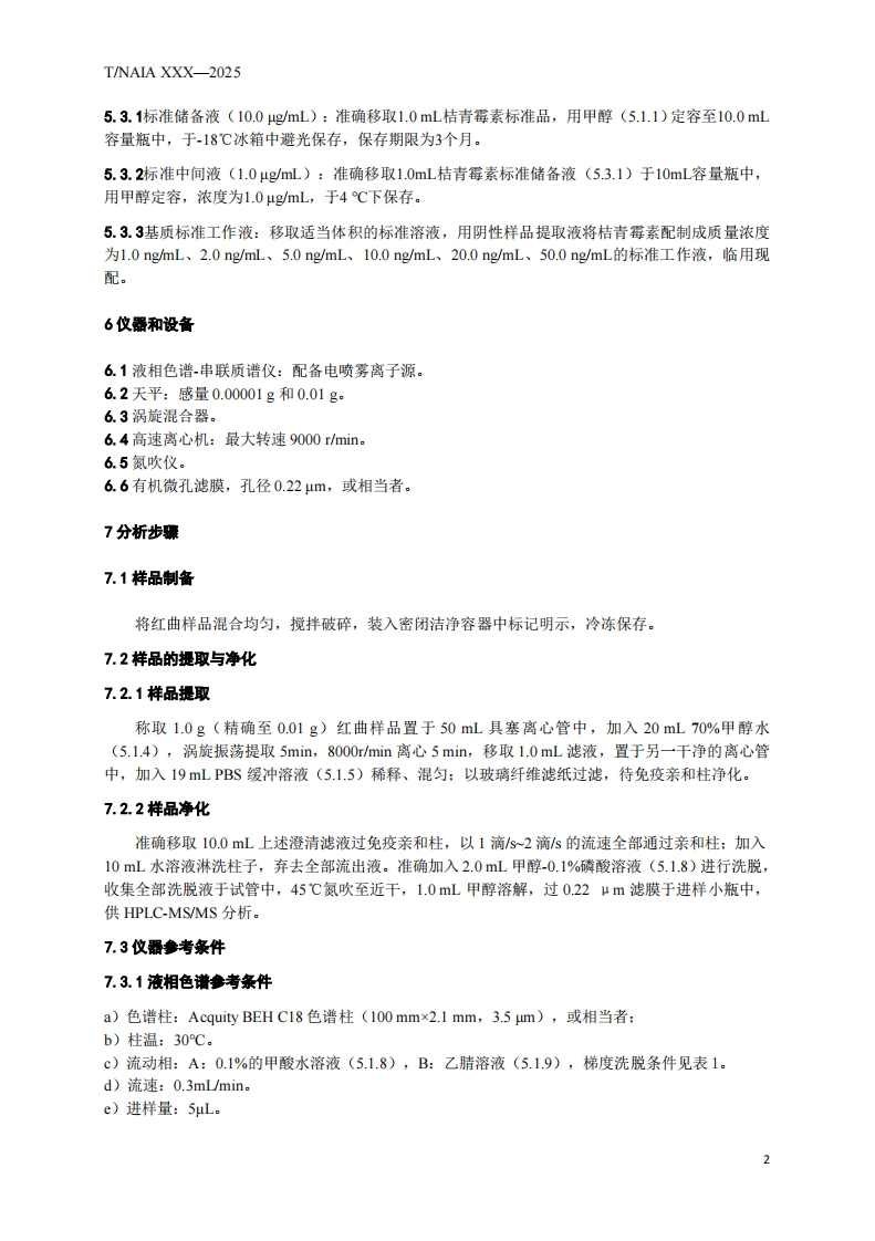 红曲中桔青霉素的测定液相色谱-串联质谱法DeterminationofCitrinininRedYeastbyHPLC-MS_MS348072@abc3小时前发布关注私信0.69MB8页031红曲中桔青霉素的测定液相色谱-串联质谱法DeterminationofCitrinininRedYeastbyHPLC-MS_MS此内容为付费资源,请付费后查看¥19¥23黄金会员免费钻石会员免费立即购买您当前未登录!建议登陆后购买,可保存购买订单付费资源 第1页 / 共8页 第2页 / 共8页 第3页 / 共8页 第4页 / 共8页 第5页 / 共8页 试读已结束,还剩3页,您可下载完整版后进行离线阅读 THE END标准规范 文本预览 ICS67.050B20团体标准T/NAIA XXX-2025红曲中桔青霉素的测定液相色谱-串联质谱法Determination of Citrinin in Red Yeast byHPLC-MS/MS2025-XX-XX发布2025-XX-XX实施宁夏化学分析测试协会发布 查看更多 收起部分 喜欢就支持一下吧收藏