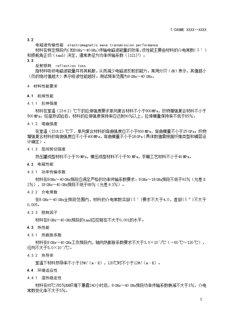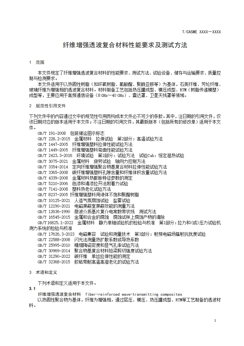 ICS点击此处添加1Cs号CCS点击此处添加cCS号T/CASME团体标准T/CASME XXXX-XXXX纤维增强透波复合材料性能要求及测试方法Performance requirements and test methods of fiber-reinforced wave-transmittingcomposite materials(征求意见稿)在提交反馈意见时,请将您知道的相联专利连同支持性文件一并附上。XXXX-XX-XX发布XXXX-XX-XX实施中国中小商业企业协会发布
