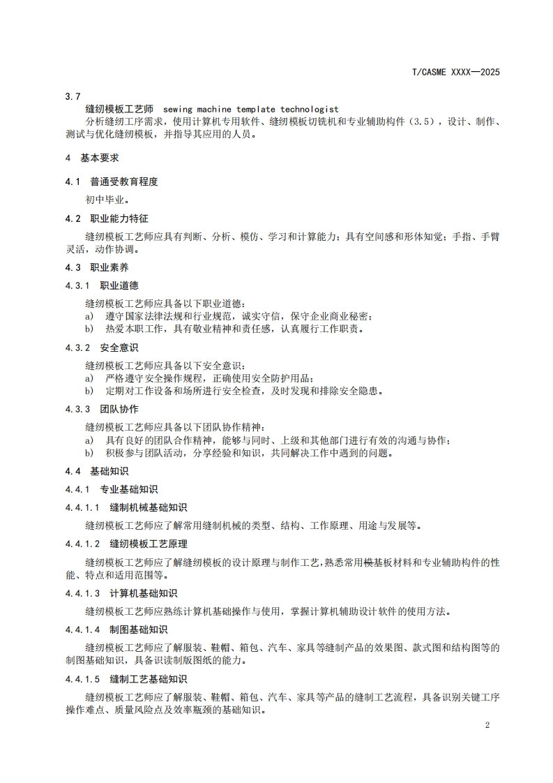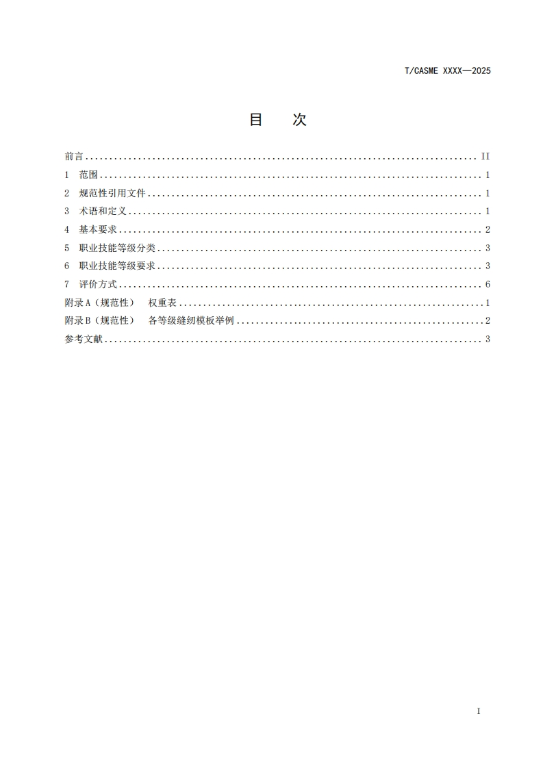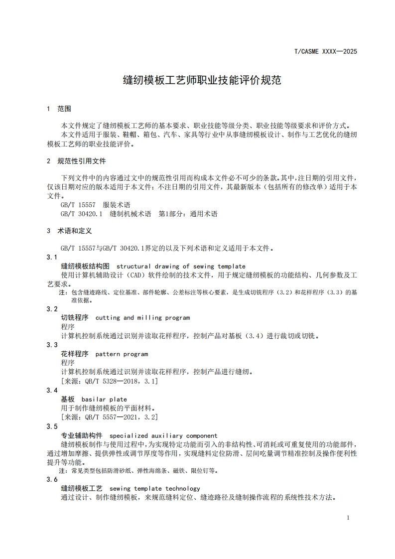 ICS03.100.30CCS A 02T/CASME团体标准T/CASME XXXX-2025缝纫模板工艺师职业技能评价规范Professional competency evaluation specification for sewing template technicians(征求意见稿)在提交反债意见时,请将您知道的相关专利连同支持性文件一并附上。2025-Xx-XX发布2025-Xx-XX实施中国中小商业企业协会发布