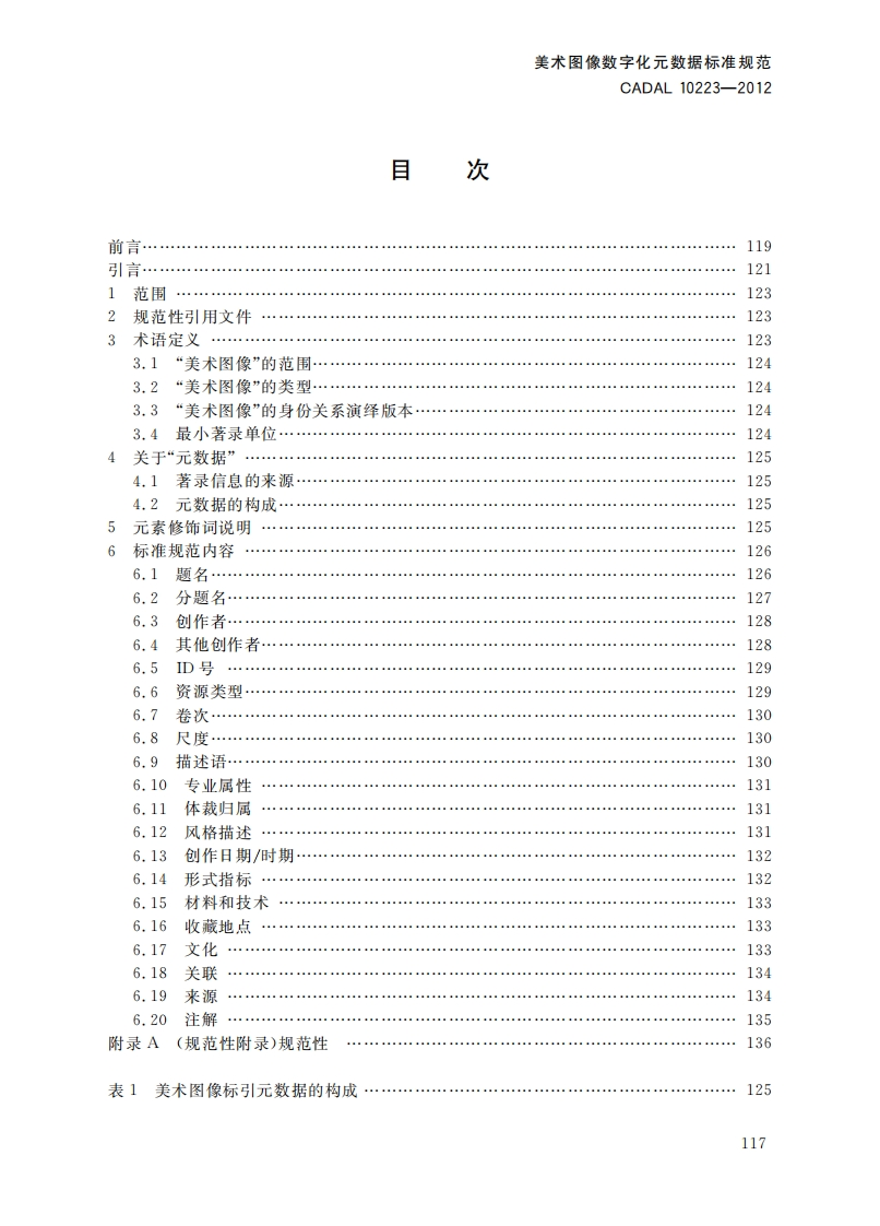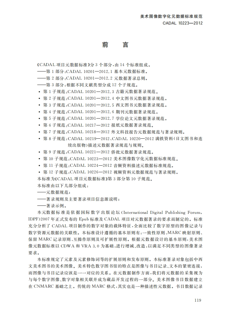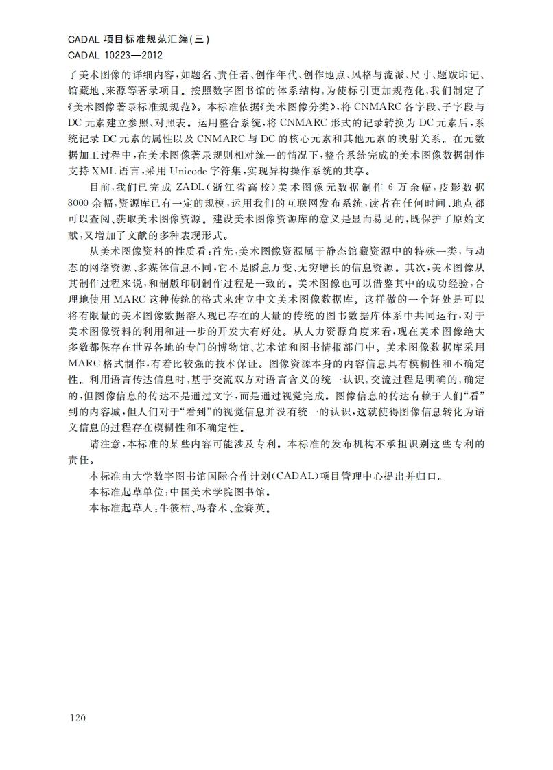美术图像数字化元数据标准规范TheArtofDigitalImageMetadataStandard第一稿348072@abc昨天发布关注私信1.37MB23页031美术图像数字化元数据标准规范TheArtofDigitalImageMetadataStandard第一稿此内容为付费资源,请付费后查看¥19¥23黄金会员免费钻石会员免费立即购买您当前未登录!建议登陆后购买,可保存购买订单付费资源 第1页 / 共23页 第2页 / 共23页 第3页 / 共23页 第4页 / 共23页 第5页 / 共23页 试读已结束,还剩18页,您可下载完整版后进行离线阅读 THE END标准规范 文本预览 10S01.140.20A14C A D A L项目标准CADAL10223-2012美术图像数字化元数据标准规范The Art of Digital Image Metadata Standard第一稿201205-08发布20120509实施CADAL项目管理中心发布 查看更多 收起部分 喜欢就支持一下吧收藏